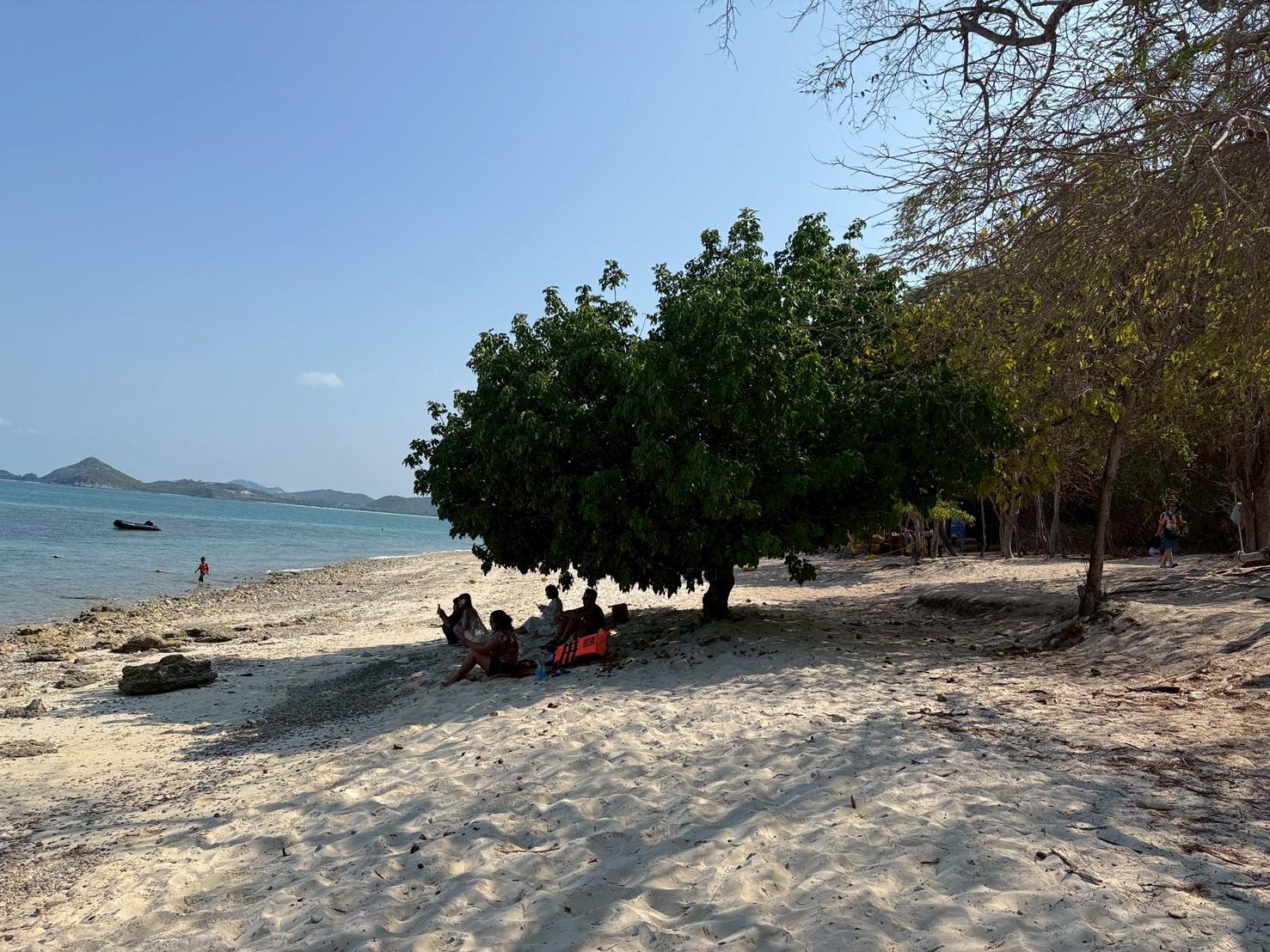 ตอนไปถึงผมไปเรือเที่ยวแรก แต่เห็นมีคนไปก่อน เยอะพอสมควร คนไปก่อนก็เลือกทำเล ร่มไม้ กางโต๊ะ ต่างๆ ได้ทำเลดี