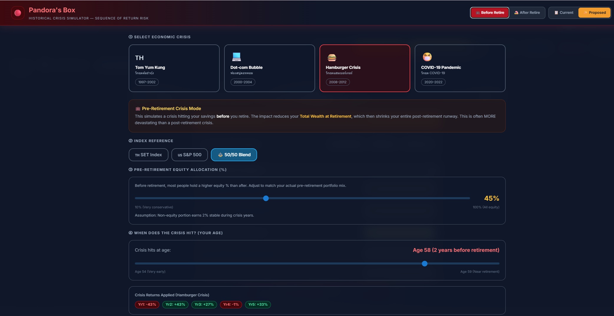 เลือกวิกฤตเศรษฐกิจจริงจากประวัติศาสตร์ แล้วฉีดเข้าไปในแผนเกษียณของคุณโดยตรง เพื่อดูว่าถ้าเกิดเหตุการณ์เหล่านี้ขึ้นจริงในช่วงที่คุณเกษียณ แผนของคุณจะรอดไหม: