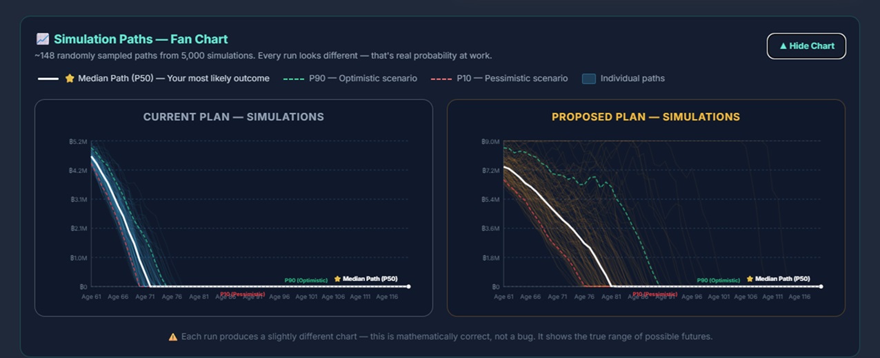 3. Monte Carlo Simulation 5,000 รอบ นี่คืออาวุธระดับโลกที่ NASA และ Wall Street ใช้ครับ แทนที่จะคำนวณแบบเส้นตรง (สมมติผลตอบแทน 8% ทุกปีตลอดไป ซึ่งไม่มีทางเป็นจริง) ระบบจะ สุ่มจำลองอนาคต 5,000 จักรวาลคู่ขนาน — บางจักรวาลโชคดี บางจักรวาลโชคร้าย แล้วบอกผลออกมาเป็น "โอกาสรอด (%)" แทนการฟันธงตัวเลขเดียวที่ไม่มีวันแม่นยำ
