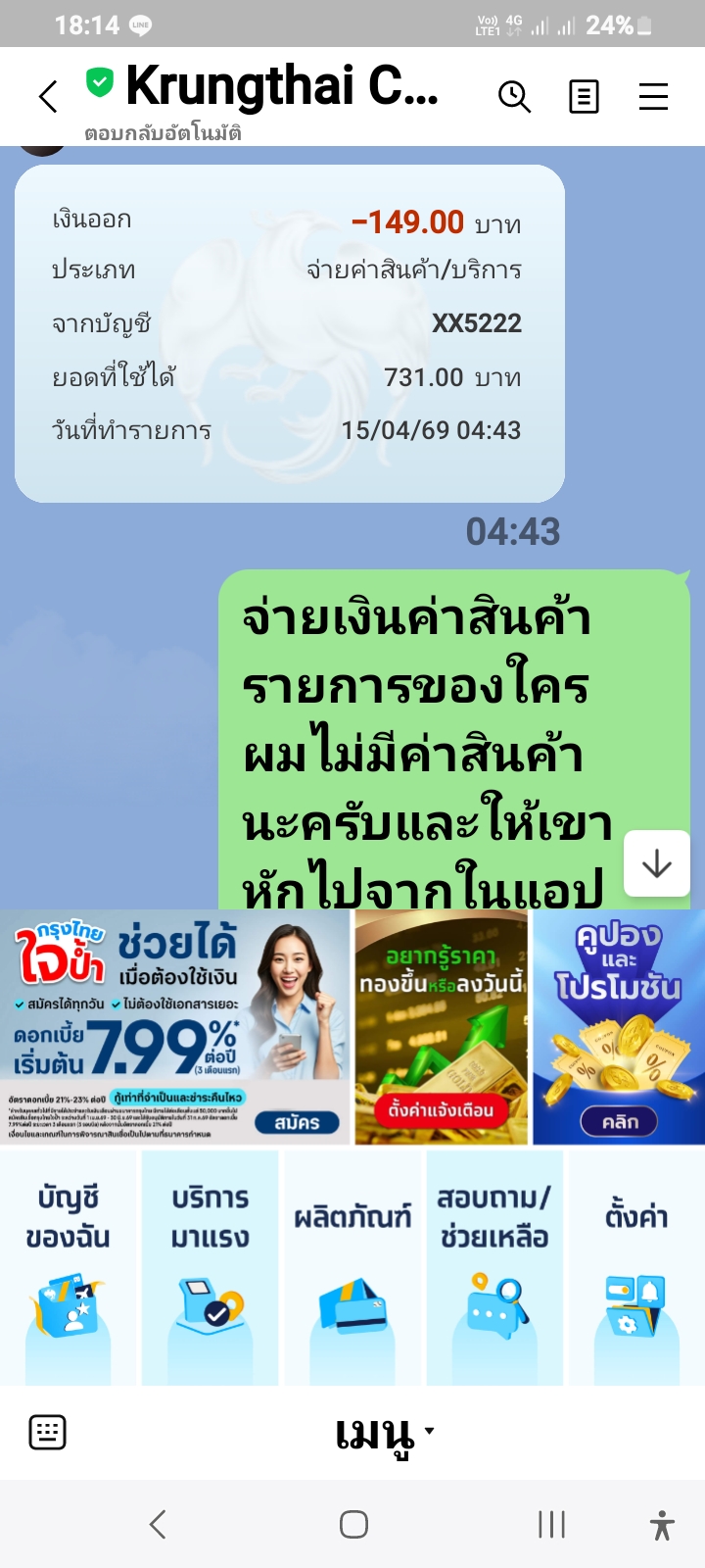 ผมโดนหักเงินจาก app ธนาคารกรุงไทยจำนวนเงิน 149 บาทต้องการขอเงินคืน