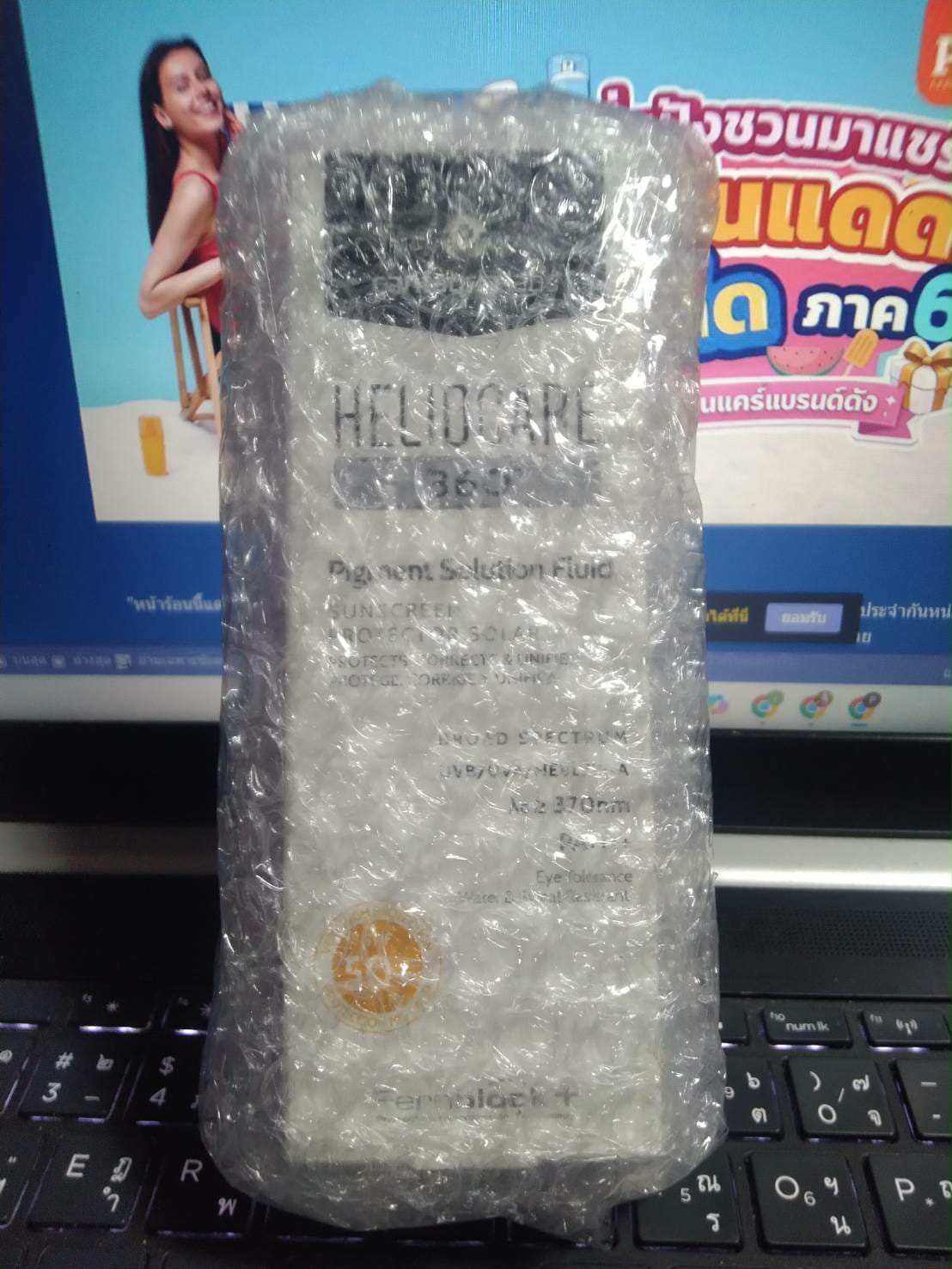 แกะกล่องพัสดุออกมา ก็จะเจอกล่องผลิตภัณฑ์ Heliocare 360° Pigment Solution Fluid SPF 50+ ตัวนี้มีดีไซน์ที่ดู Professional และน่าเชื่อถือมากๆ กล่องด้านหลังระบุคุณสมบัติชัดเจน ทั้งการปกป้องครบทุกรังสี (UVA, UVB, แสงสีฟ้า, IR) และเทคโนโลยี Fernblock®+