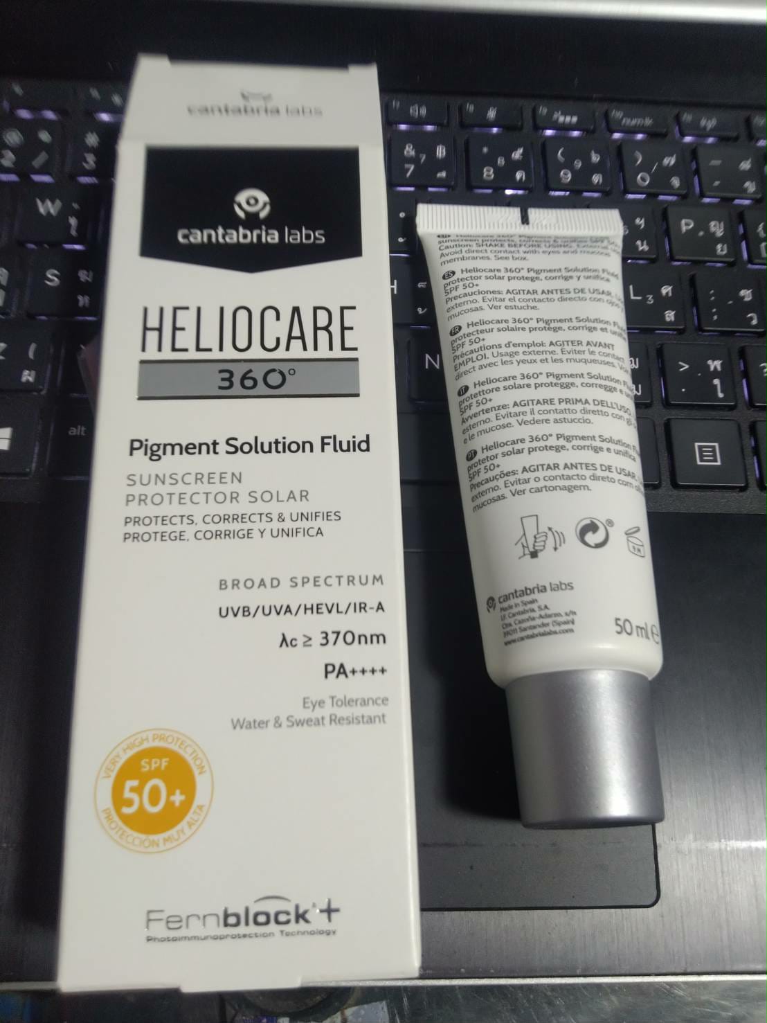 Heliocare 360° Pigment Solution Fluid SPF 50+ ตัวนี้มีดีไซน์ที่ดู Professional และน่าเชื่อถือมากๆ กล่องด้านหลังระบุคุณสมบัติชัดเจน ทั้งการปกป้องครบทุกรังสี (UVA, UVB, แสงสีฟ้า, IR) และเทคโนโลยี Fernblock®+