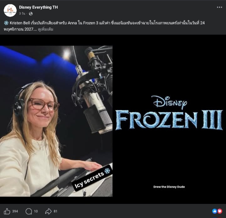 อ้อ.... ลืมไป เมื่อ 3 วันก่อน คุณ Kristen Bell (ให้เสียงอันนา) ได้เริ่มบันทึกเสียงใน FROZEN 3