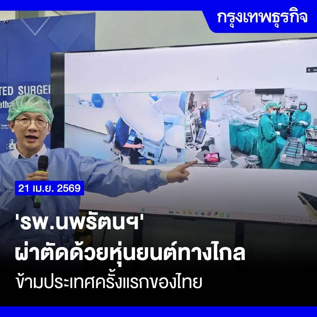 ก้าวสำคัญของระบบสาธารณสุขไทย ในการยกระดับการรักษาไร้พรมแดน เข้าถึงผู้เชี่ยวชาญระดับโลก โดยการผ่าตัดด้วยหุ่นยนต์ทางไกลกรณีแรกของประเทศไทย เป็นผู้ป่วยนิ่วในถุงน้ำดีที่เข้ารับการรักษาที่รพ.นพรัตนราชธานี ประเทศไทย ขณะที่ศัลยแพทย์ของรพ.นพรัตนฯควบคุมหุ่นยนต์ผ่าตัดจาก West China Hospital เมืองเฉิงตู สาธารณรัฐประชาชนจีน ผ่านระบบสื่อสารความเร็วสูงแบบเรียลไทม์ เป็นการผ่าตัดถุงน้ำดีด้วยหุ่นยนต์ (Robotic-Assisted Cholecystectomy) ซึ่งสามารถดำเนินการได้อย่างแม่นยำและปลอดภัย