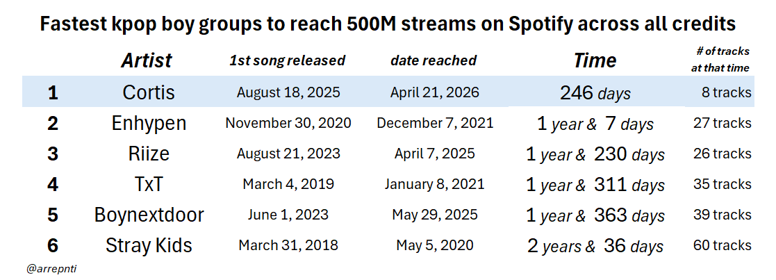 “CORTIS” กลายเป็นบอยแบนด์ Kpop ที่ทำยอดสตรีมบน Spotify ครบ 500 ล้านครั้งเร็วที่สุดในประวัติศาสตร์ โดยใช้เวลาเพียง 246 วัน จากทั้งหมด 8 เพลง!