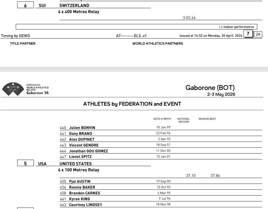รายชื่อทีมจะเรียงตามตัวอักษร แต่ในภาพด้านล่างคือ สวิสเซอร์แลนด์ (SUI) แล้วข้ามตัว T ไปสหรัฐเมริกา (USA) เลย แสดงว่าไม่มีทีมไทยเข้าร่วมแข่งขัน โดยรายชื่อด้านล่าง เป็นประเภท 4x100 เมตรชาย และ 4x400 เมตรชาย