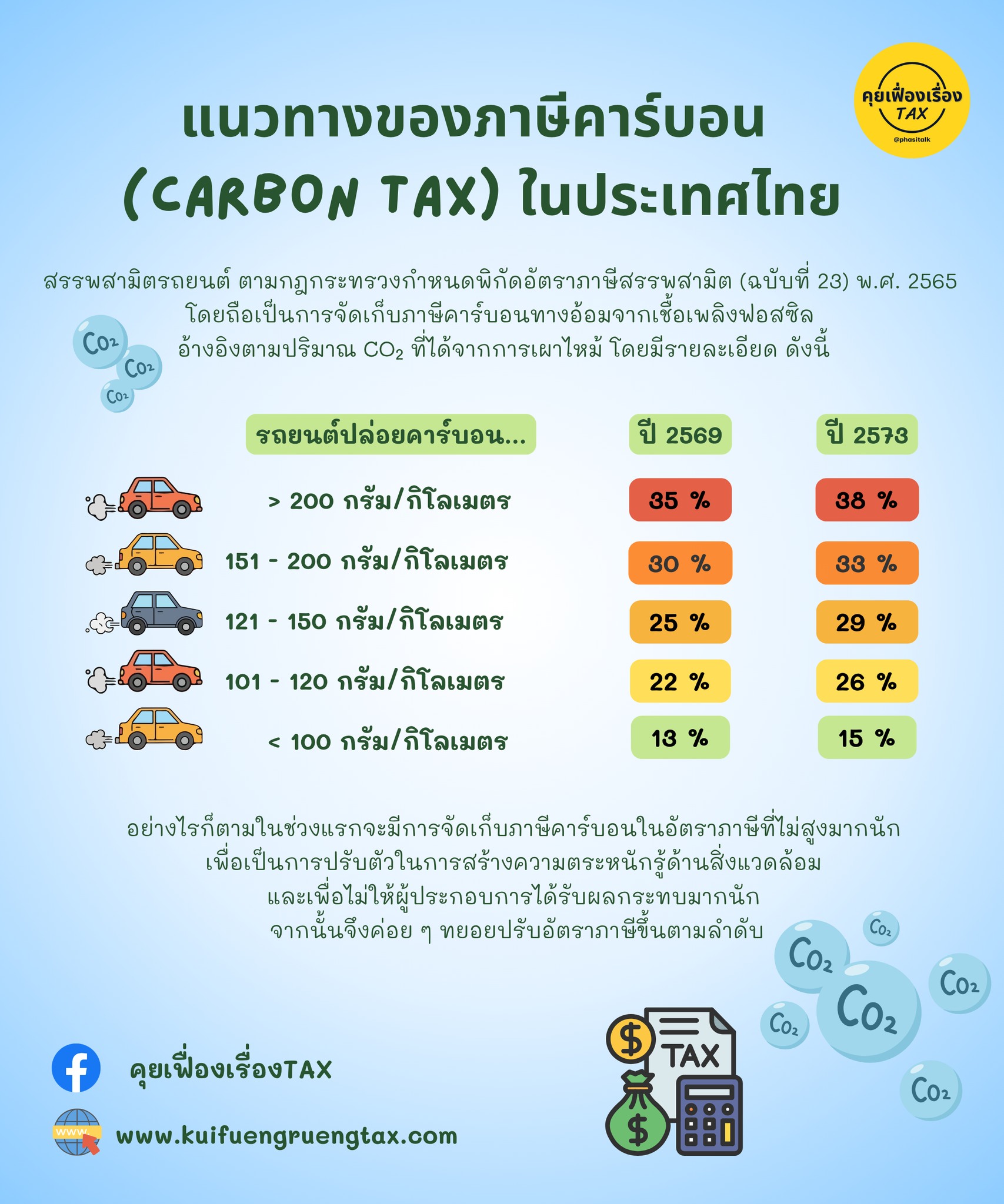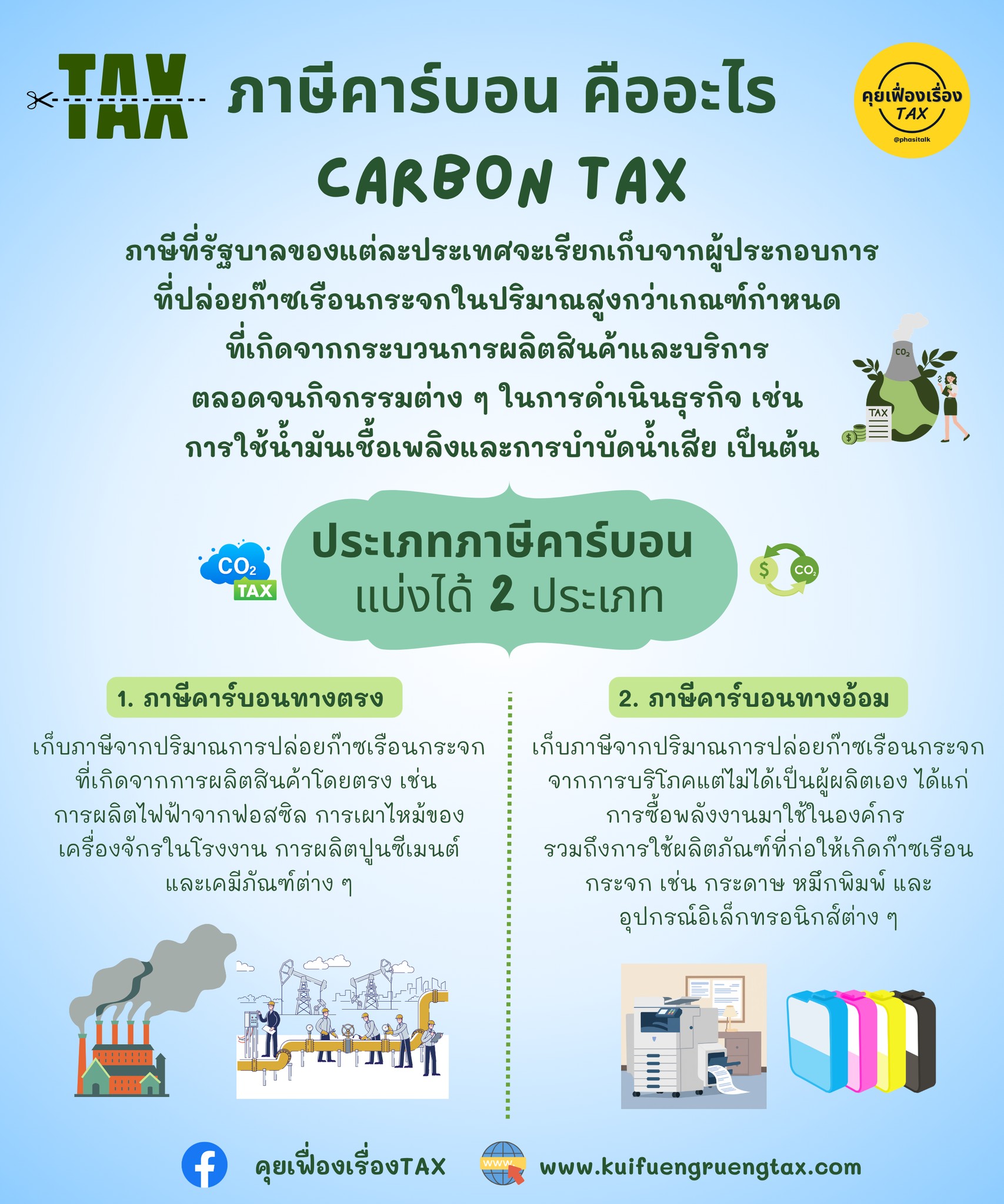 ภาษีคาร์บอน (Carbon Tax) คือ ภาษีที่รัฐบาลของแต่ละประเทศจะเรียกเก็บจากผู้ประกอบการที่ปล่อยก๊าซเรือนกระจกในปริมาณสูงกว่าเกณฑ์กําหนด ที่เกิดจากกระบวนการผลิตสินค้าและบริการ ตลอดจนกิจกรรมต่าง ๆ ในการดําเนินธุรกิจ เช่น การใช้น้ำมันเชื้อเพลิงและการบำบัดน้ำเสีย เป็นต้น
