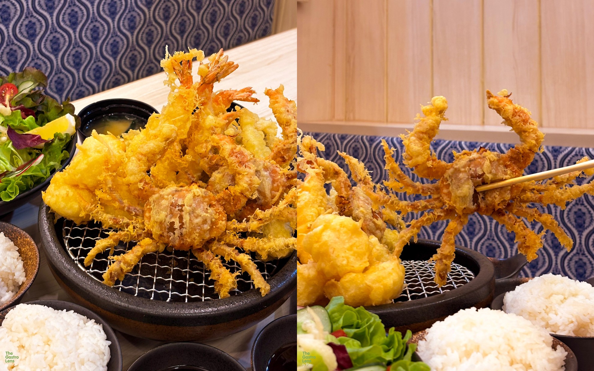 Set Giant Seafood Tempura (1100) เซตเทมปุระซีฟู้ดชุดใหญ่ที่คนรักอาหารทะเลต้องกดไลก์ จัดเต็มทั้งกุ้ง ปูนิ่ม, หอยเชลล์ มะเขือ ฟักทอง รากบัว และข้าวโพดอ่อน เสิร์ฟมาพร้อมกับเทนฉะซุป ซุปสูตรเฉพาะที่ผสมซอสเทนดงกับซอสเทมปุระเข้าด้วยกัน