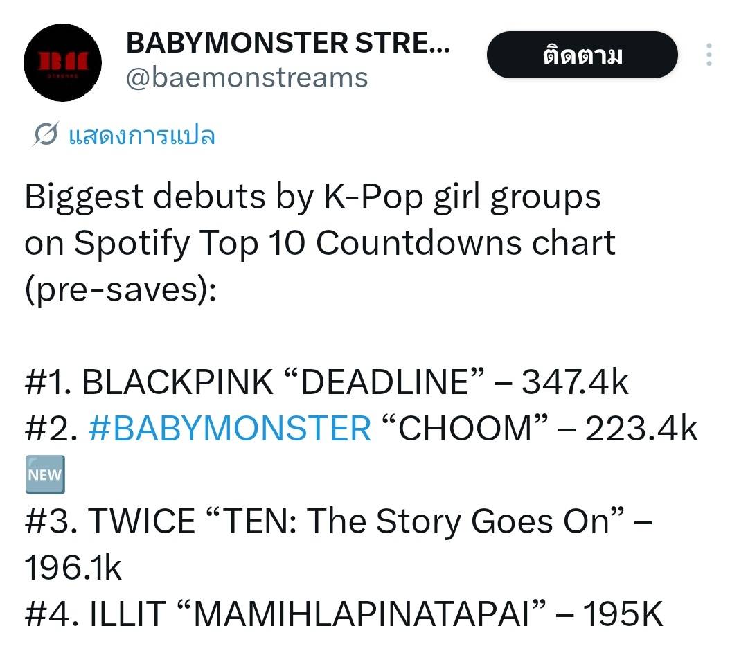 “DRIP” โดย BABYMONSTER เปิดตัวที่อันดับ 142 บน Global Spotify Chart โดยมียอดสตรีม 1,272,432 ครั้ง