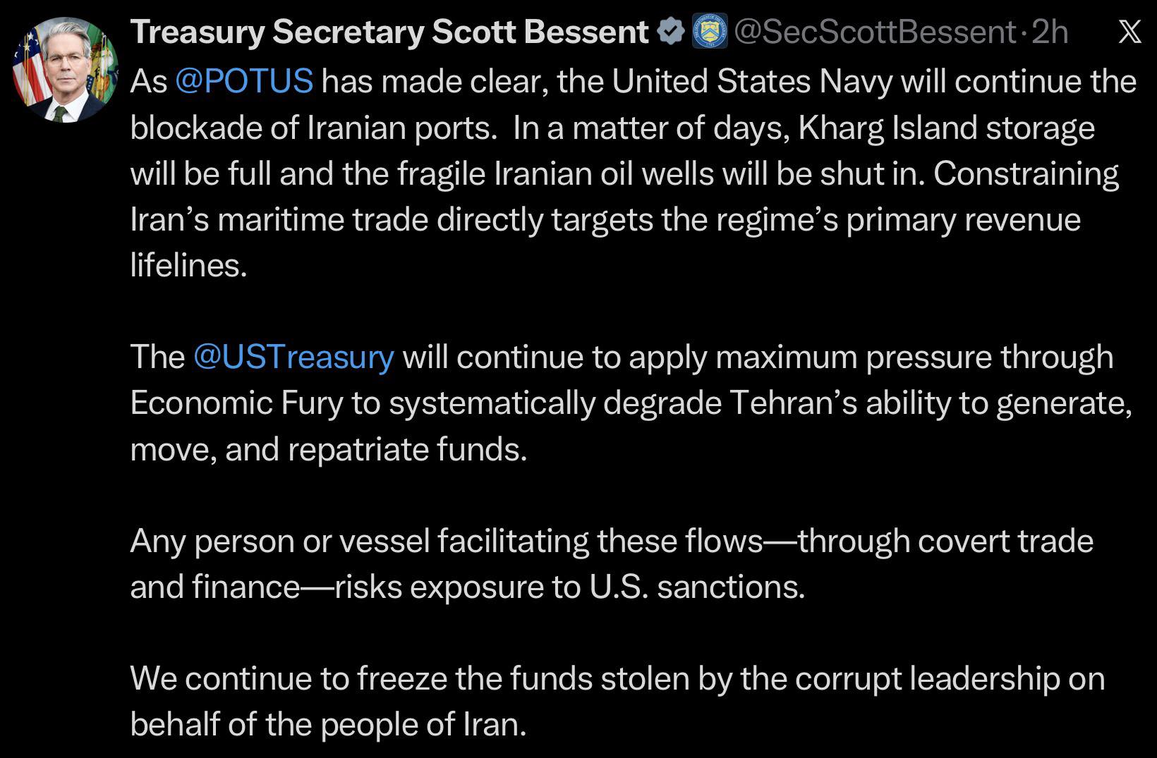 รัฐมนตรีคลัง Scott Bessent บอกว่าอีกไม่กี่วันอิหร่านจะไม่มีที่เก็บน้ำมันที่ผลิตออกมาแล้วส่งออกไม่ได้เนื่องจากถูกกองทัพเรือสหรัฐปิดล้อม ซึ่งจะทำให้ต้องปิดบ่อน้ำมันที่เป็นกระเป๋าเงินของระบอบการปกครองอิหร่าน กระทรวงการคลังสหรัฐจะใช้ปฏิบัติการ Economic Fury ควบคู่ไปกับ Epic Fury ของกองทัพเพื่อสร้างความกดดันให้แก่อิหร่านโดยการสกัดการเคลื่ิอนย้ายเงินทุน และประเทศที่ให้ความช่วยเหลืออิหร่านในการลักลอบขนส่งสินค้าหรือเคลื่ิอนย้ายเงินทุน ก็จะถูกรัฐบาลสหรัฐแซงชั่นด้วย