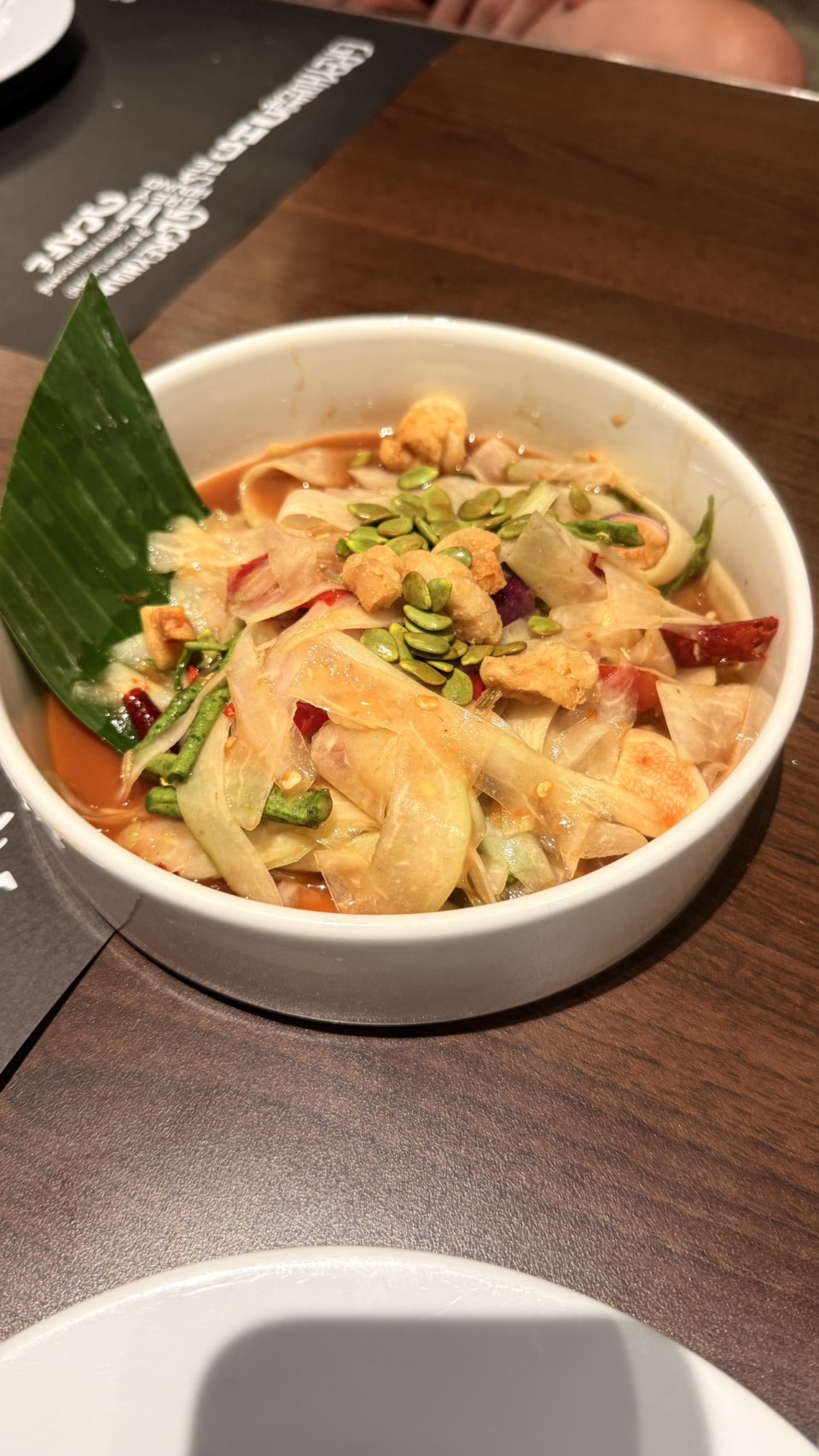 • ส้มตำหลวงพระบาง เมนูสุดคลาสสิกของไทย จานนี้แซ่บมาก ประกอบไปด้วยเส้นมะละกอเส้นใหญ่บางๆ คลุกเคล้ากับกุ้งแห้ง ถั่วลิสง มะเขือเทศ น้ำปลาร้า และโรยแคบหมูกรอบๆ