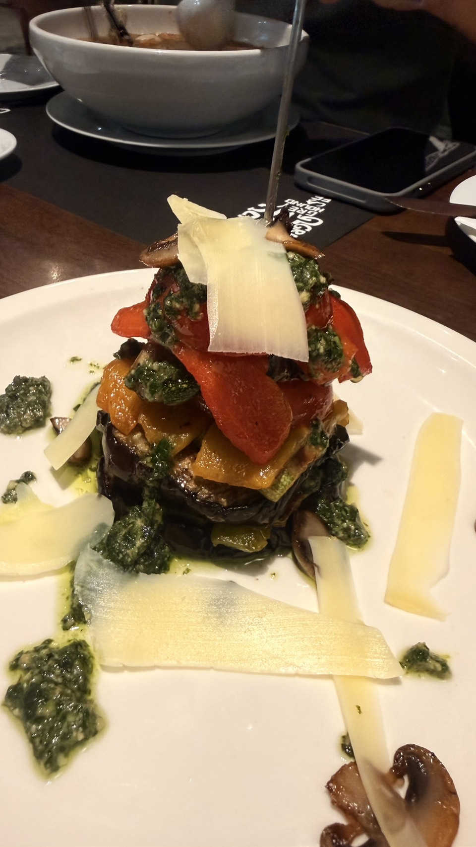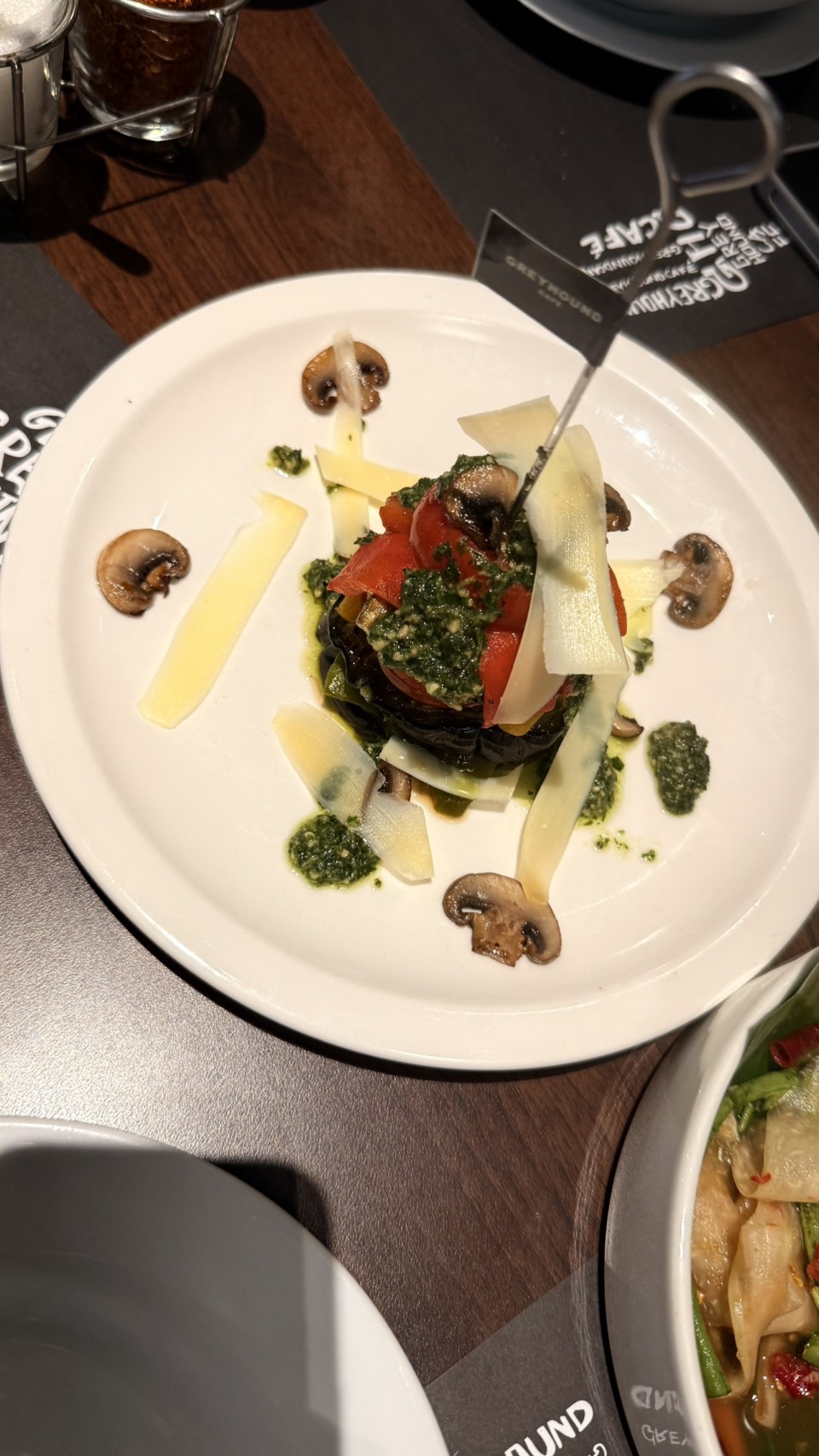 • ซอสเพสโต้กับผักย่าง ผักย่าง 🍆มะเขือยาวม่วง มะเขือเทศ เห็ด และชีสแผ่น คลุกเคล้ากับซอสเพสโต้รสชาติหอมมัน