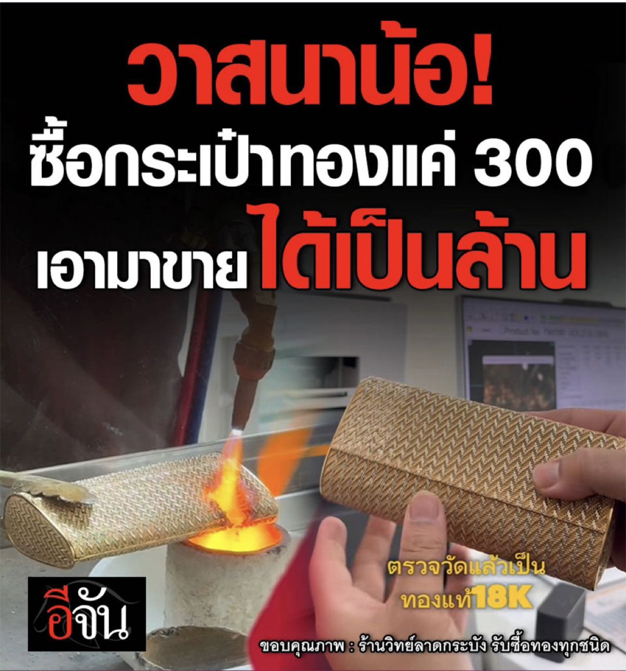 • ราคาประเมิน: จากกระเป๋าราคา 300 บาท เมื่อหลอมออกมาเป็นทองคำแท้แล้ว มีมูลค่าสูงถึง 1.2 ล้านบาท (หรือประมาณ 1 ล้านบาทตามข้อความในภาพแรก)