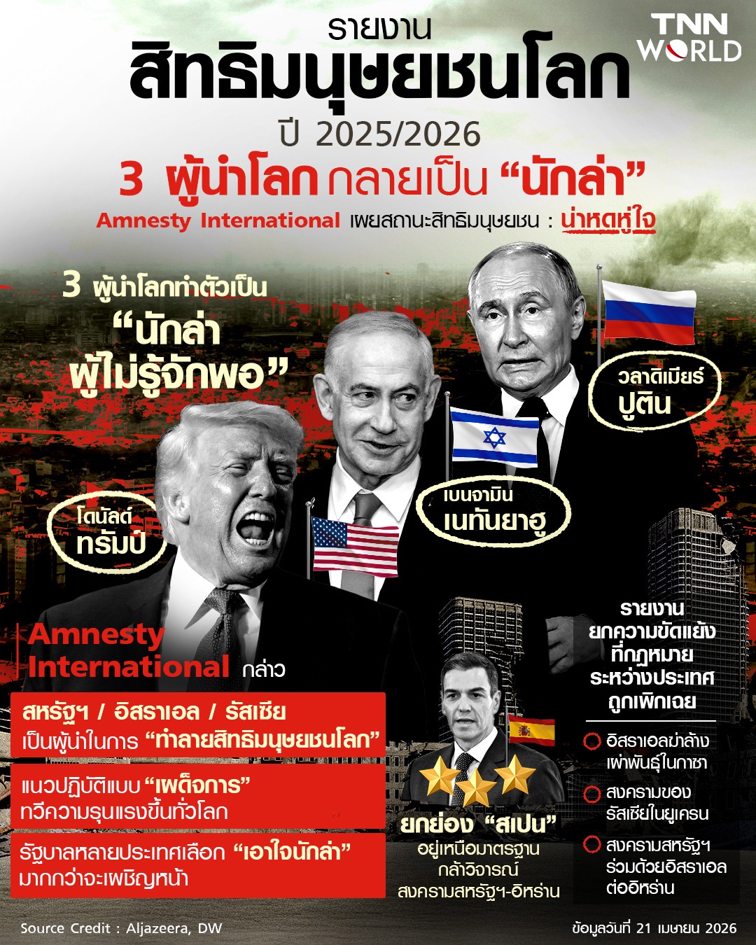 รายงานสิทธิมนุษยชนโลก ปี 2025/2026 3 ผู้นำโลก กลายเป็น " นักล่า " Amnesty International เผยสถานะสิทธิมนุษยชน:น่าหดหู่ใจ