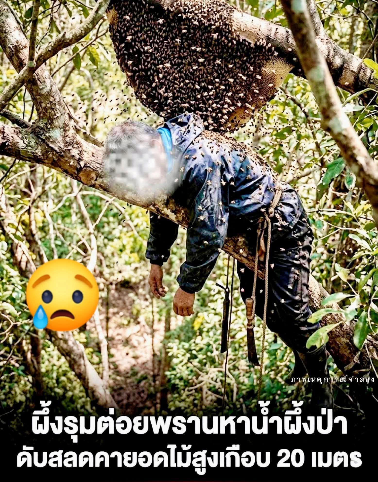 สาเหตุคือขึ้นตีรังผึ้งจนเสร็จแล้ว แต่ลืมของ ย้อนขึ้นไปเก็บอีกรอบ จึงถูกฝูงผึ้งนับร้อยรุมต่อยดับสลดบนยอดไม้