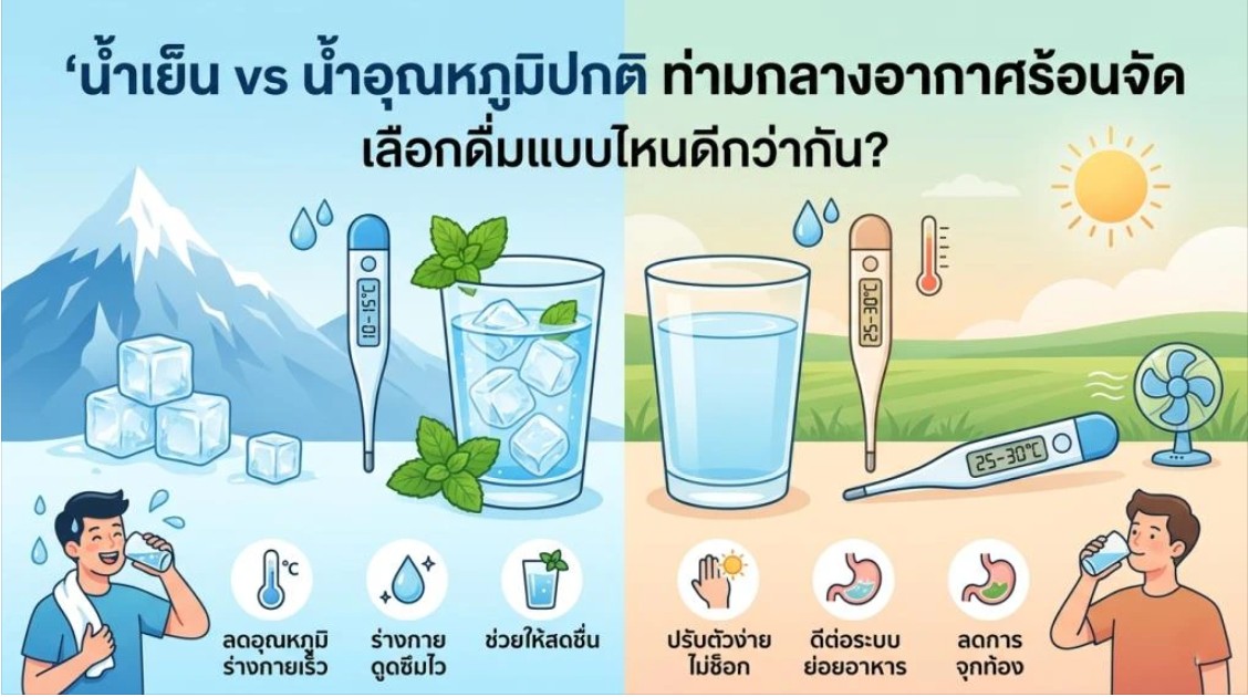 หากอยู่กลางแจ้งหรือร้อนจัด: แนะนำให้จิบน้ำอุณหภูมิปกติก่อน เพื่อให้ร่างกายปรับตัวสักครู่ แล้วค่อยดื่มน้ำเย็นตามเพื่อช่วยลดความร้อนสะสมภายใน