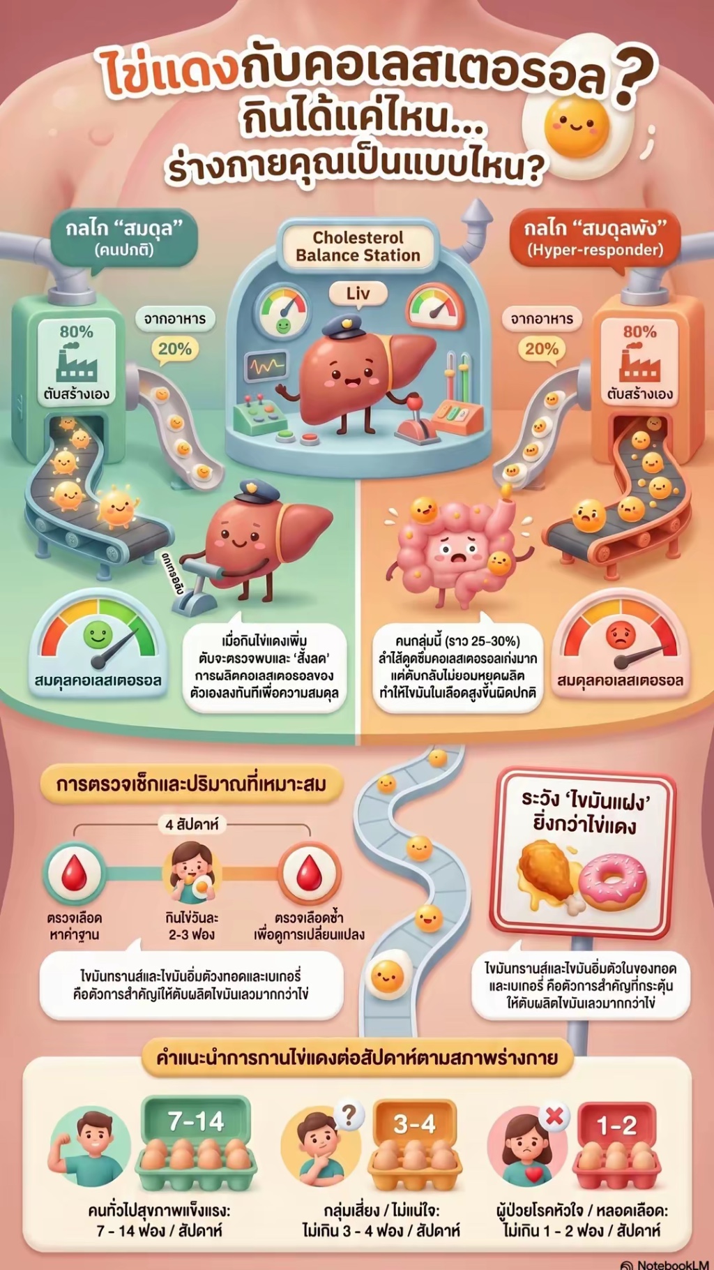 • กลไกที่ทำให้คนกลุ่มนี้มีไขมันเลว (LDL) สูงผิดปกติเมื่อทานไข่แดง คือ การดูดซึมที่ลำไส้ทำงานมากเกินไป, ระบบเบรกของตับทำงานได้ไม่เต็มที่ (ลดการสร้างคอเลสเตอรอลได้ไม่มากพอ), และการกำจัด LDL ออกจากเลือดลดลง