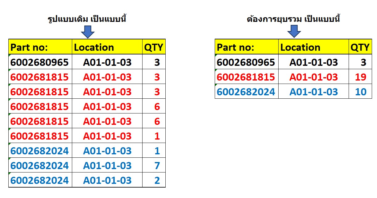 1. ต้องการยุบรวม Part No. ที่ซ้ำกันในแต่ละ Location แล้วหาผลรวมลงในบรรทัดเดียว ดังรูป ต้องทำอย่างไร