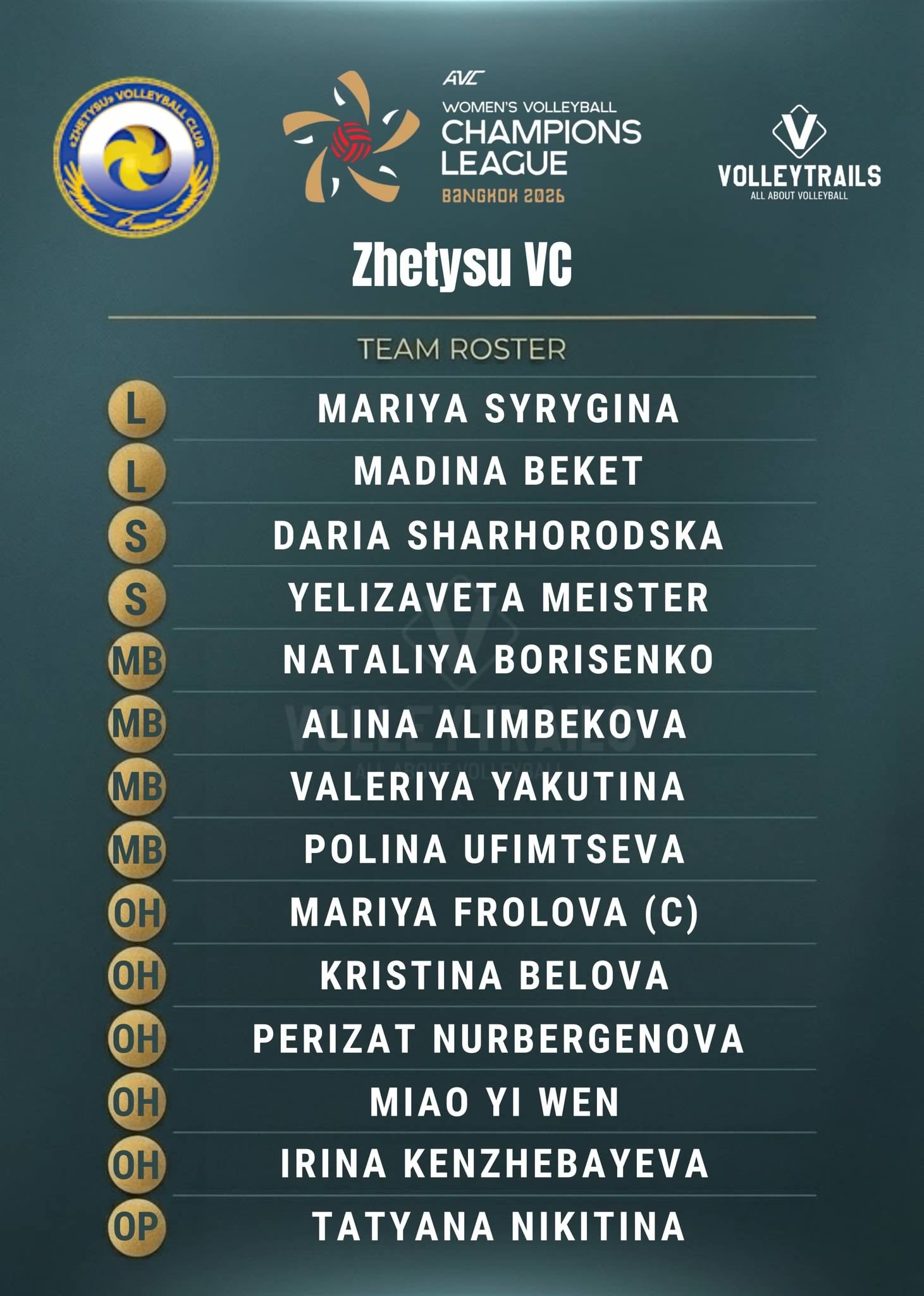 รายชื่อสาวZhetysu VC🇰🇿 ดวลสาวปักกิ่งลุยศึกAVC Women’s Volleyball Champion League Bangkok🇹🇭 2026