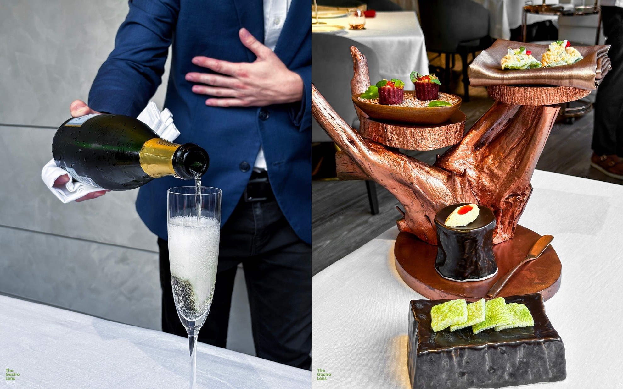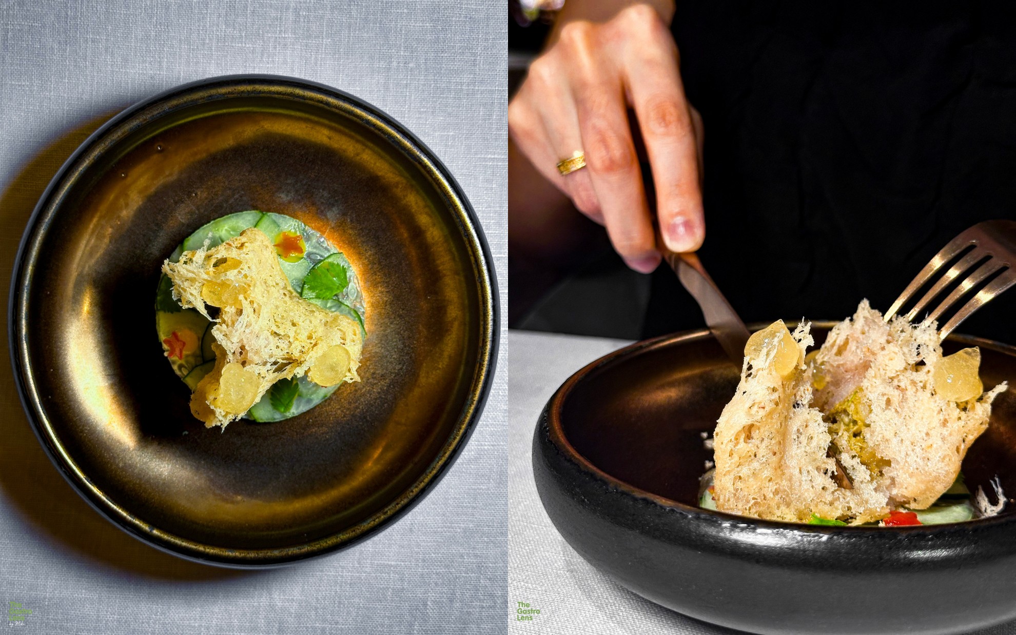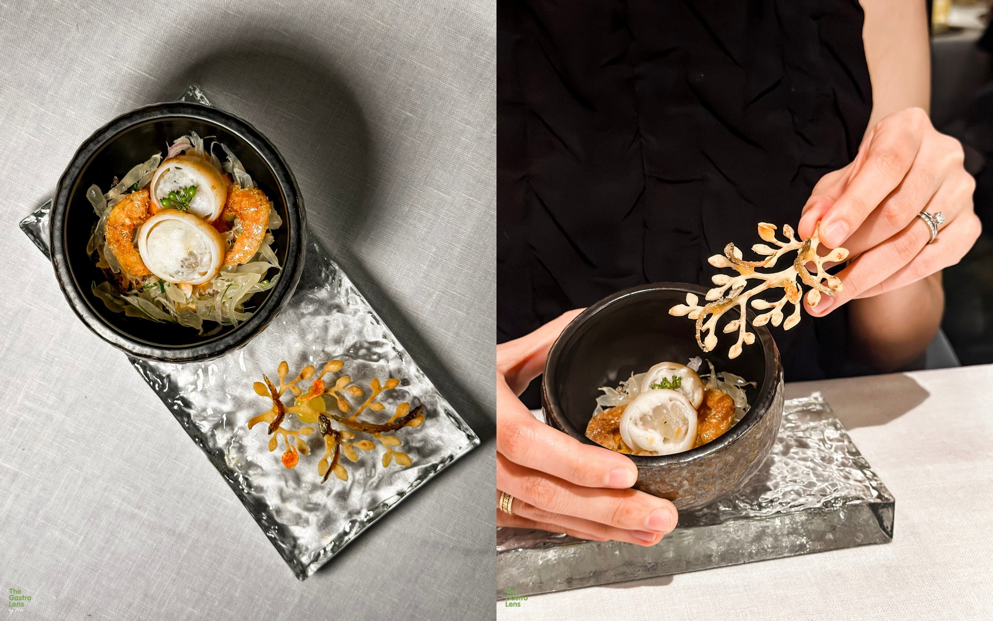 Amuse-Bouche เปิดต่อมรับรสด้วย 3 คำเรียกน้ำย่อยสไตล์ไทยโบราณ เริ่มจากความกรุบกรอบของข้าวตังหน้าตั้ง ที่ตัวข้าวตังใช้ข้าวหอมสุพรรณโรงผงสามเกลอที่เชฟเบลนเอง ป้ายด้วยหน้าตั้งที่เชฟปรุงมาจนนัวหอมมัน ตามด้วยความจัดจ้านกลมกล่อมของน้ำพริกลงเรือ ที่ใช้ข้าวสังข์หยดทำเป็นทาร์ต และตัวน้ำพริกมีความหอมของกะปินัวๆ และปิดท้ายด้วยเมี่ยงยำที่ให้กลิ่นหอมซิตรัสสดชื่นของส้มซ่า พร้อมไข่ปูและเนื้อปู ที่วางอยู่บนแครกเกอร์ใบชะพลูกรอบๆ ปลุกน้ำย่อยได้ดีมาก