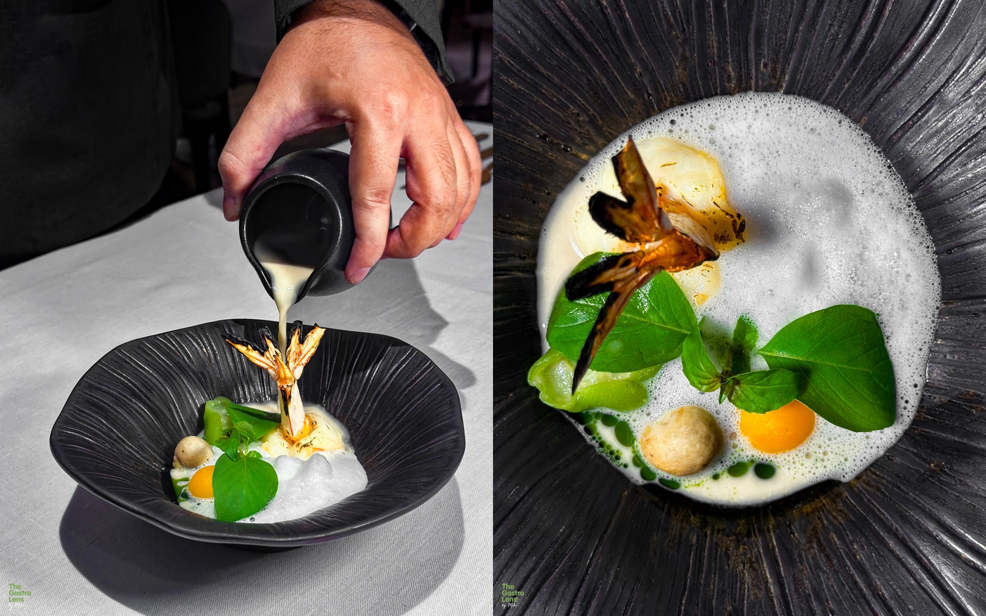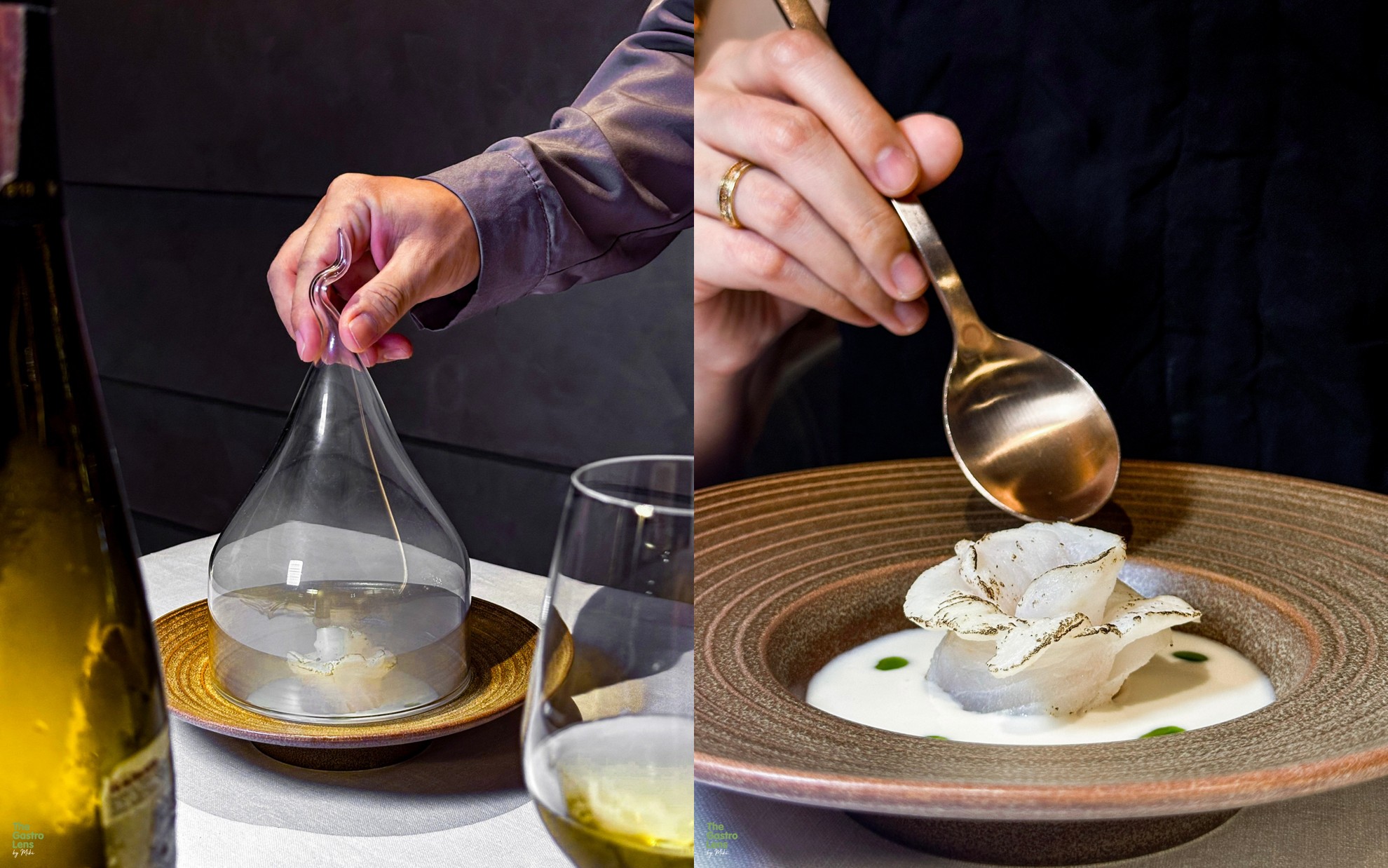 Dry-Aged Fish with Tom-Kha Cold Soup ตีความต้มข่าใหม่ ในรูปแบบซุปเย็น หอมกลิ่นข่าและกะทินวลๆ ตัดด้วยน้ำมันผักชีหอมๆ ทานคู่กับปลาเนื้อขาวที่นำไป Dry-Aged จนเนื้อมีความหนึบเด้ง ช่วยดึงรสอูมามิออกมาได้อย่างสมบูรณ์แบบ