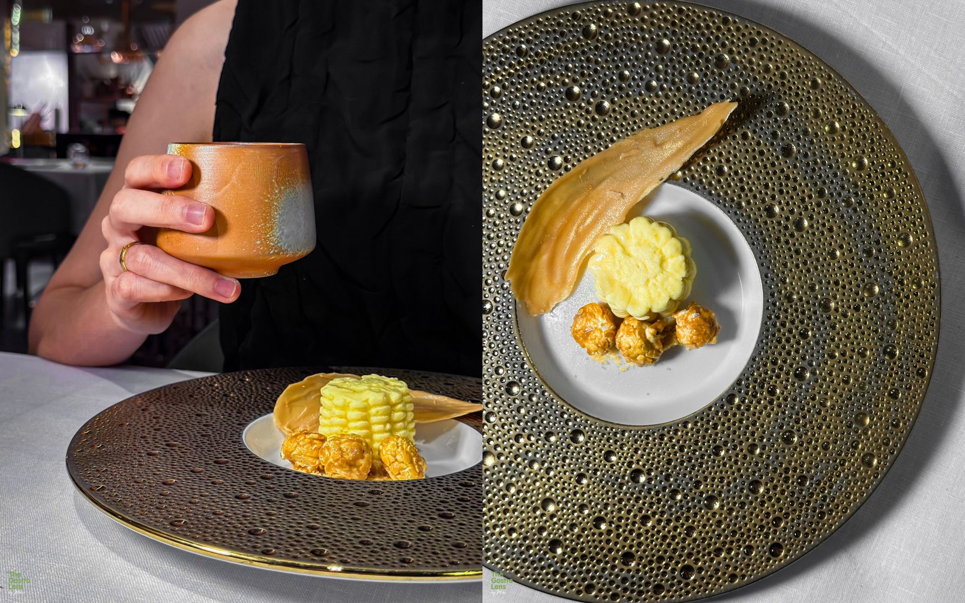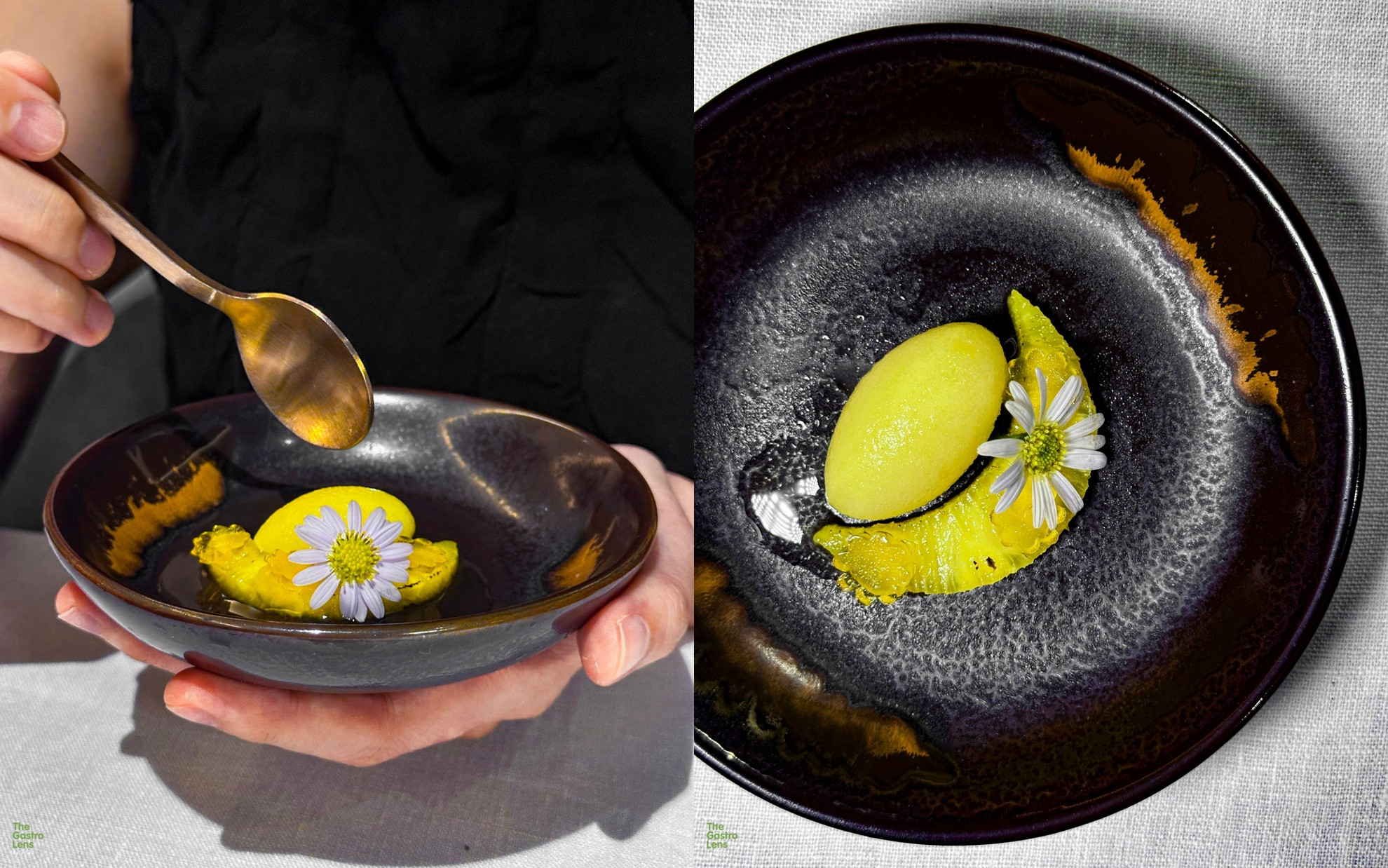 Hom-Su-Wan Cello จานคลีนปากที่ดัดแปลงแนวคิดมาจากเหล้าหวานสไตล์อิตาลี แต่ใช้ความหอมหวานของสับปะรดซอร์เบย์ ผสมกับน้ำผึ้งป่าเจลลี่จากดอยเต่า และกลิ่นอายความคราฟต์ของสาโทจากอุบล ทานแล้วรีเฟรชสุดๆ