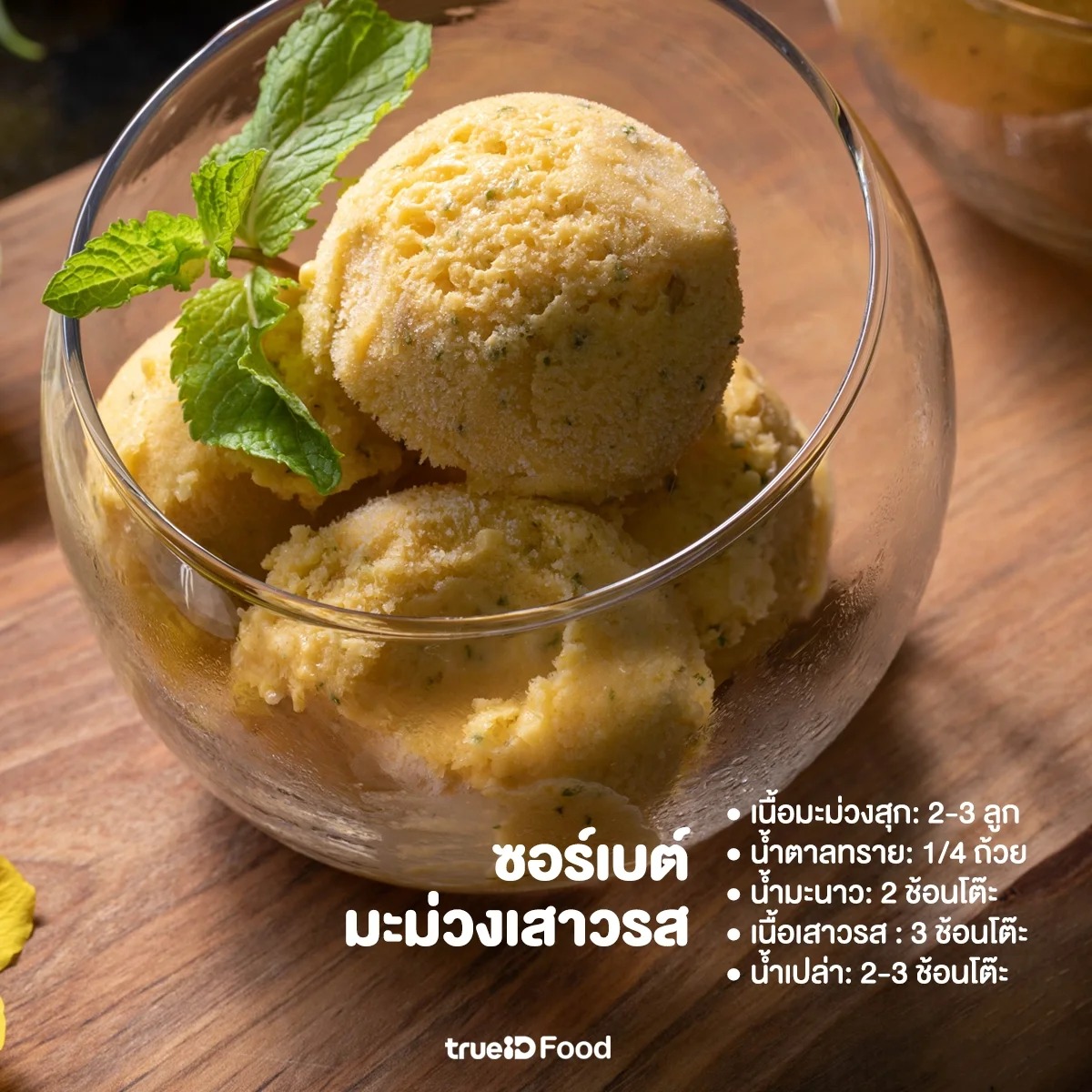 🌟 เคล็ดลับเพิ่มเติม : มะม่วงมีเพคติน (Pectin) สูงตามธรรมชาติอยู่แล้ว ทำให้ซอร์เบต์มะม่วงจะมีความหนืดและเนียน