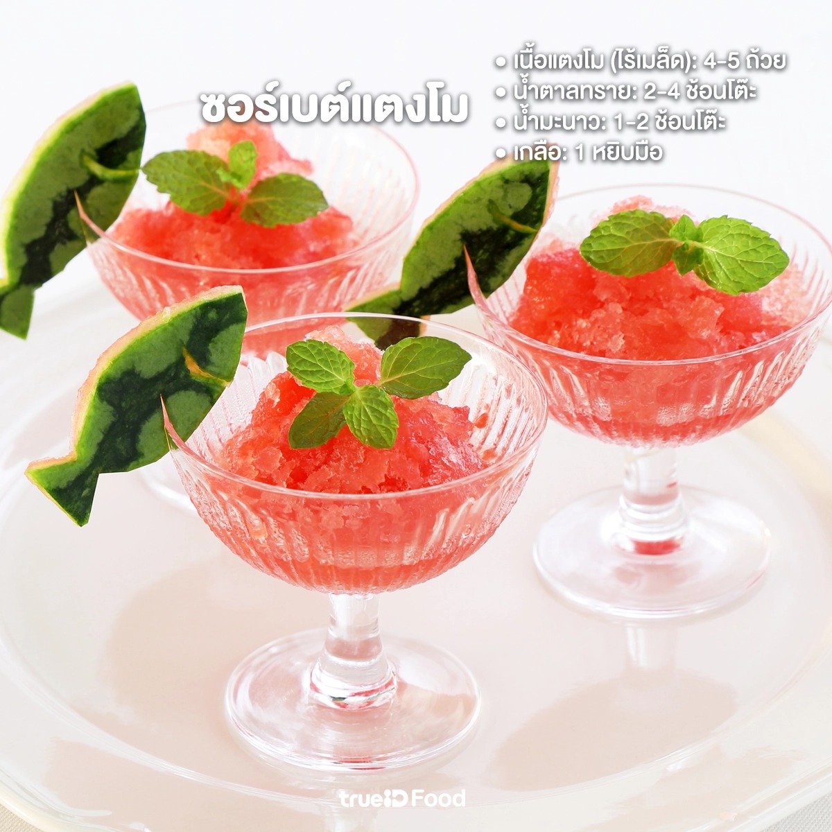 - ตกแต่งด้วยใบสะระแหน่และเนื้อแตงโมชิ้นเล็ก
