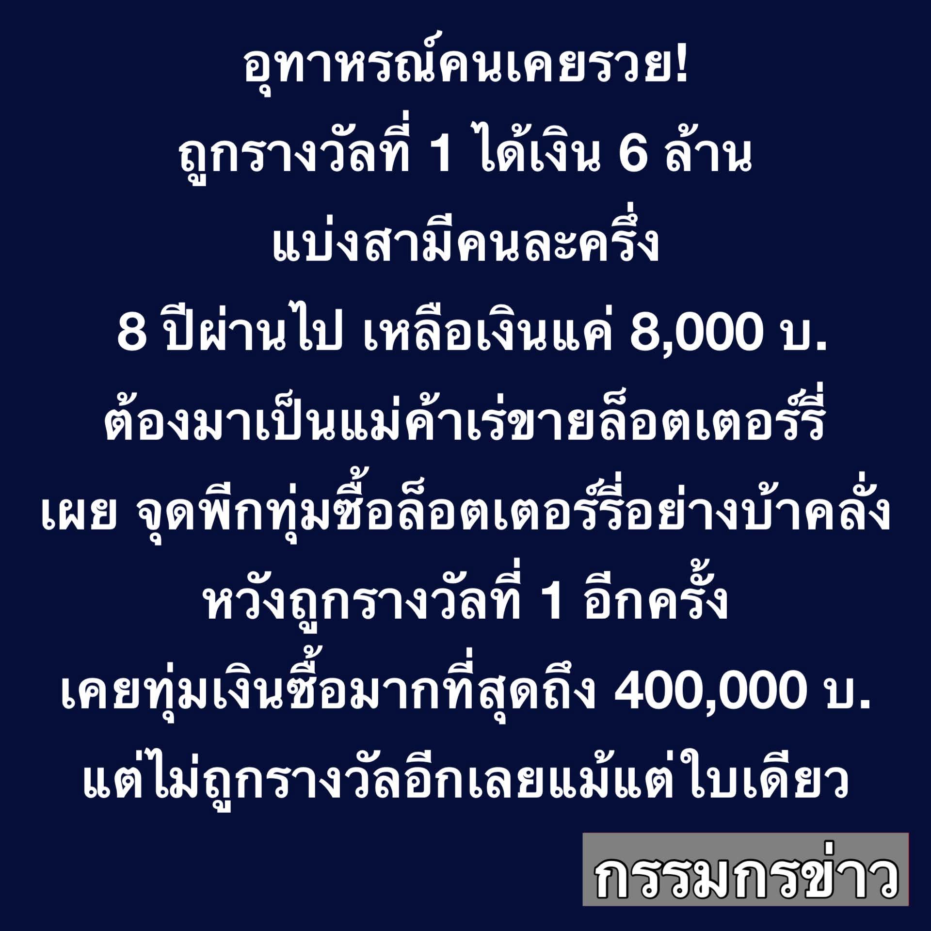 อุทาหรณ์คนเคยรวย! ถูกรางวัลที่ 1 ได้เงิน 6 ล้าน เมื่อปี 61 แบ่งสามีคนละครึ่ง 8 ปีผ่านไป เหลือเงินในบัญชีแค่ 8,000 บาท ต้องผันตัวมาเป็นแม่ค้าเร่ขายล็อตเตอร์รี่ เผย จุดพีกเพราะหวัง ’ต่อเงิน‘ ด้วยการทุ่มซื้อสลากกินแบ่งรัฐบาลอย่างบ้าคลั่ง หวังถูกรางวัลที่ 1 อีกครั้ง เคยทุ่มเงินซื้อมากที่สุดถึง 400,000 บาท แต่ไม่ถูกรางวัลอีกเลยแม้แต่ใบเดียว