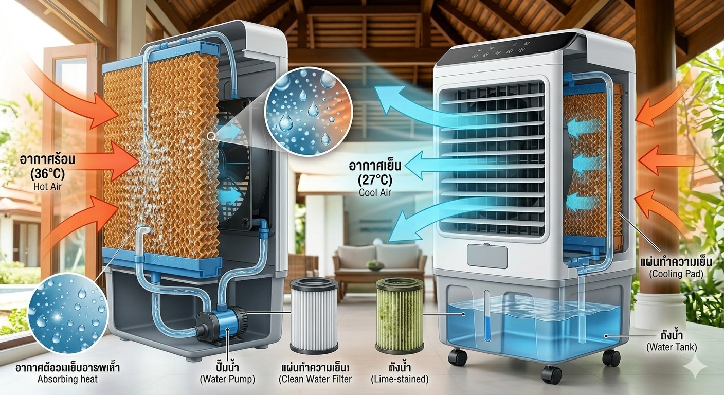 พัดลมไอเย็น (Evaporative Cooler) ไม่ใช่แอร์ และไม่ใช่พัดลมไอน้ำที่พ่นละอองน้ำออกมา หลักการทำงานของมันคือการใช้เทคนิค Evaporative Cooling หรือการระเหยของน้ำเพื่อดึงความร้อนออกจากอากาศ ตัวเครื่องจะมีแผ่นทำความเย็น (Cooling Pad) ที่ถูกรดด้วยน้ำจนชุ่มอยู่เสมอ เมื่อพัดลมดูดอากาศร้อนจากข้างนอกผ่านแผ่นนี้ น้ำจะระเหยกลายเป็นไอและดึงความร้อนรอบข้างออกไป ทำให้ลมที่พัดออกมามีอุณหภูมิลดลงประมาณ 2-5 องศาเซลเซียส ให้ความรู้สึกสดชื่นคล้ายลมที่พัดผ่านผิวน้ำตก