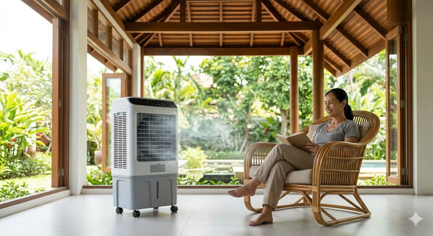 ตอบโจทย์พื้นที่เปิดโล่ง: ในพื้นที่ที่แอร์ทำงานไม่ได้ผล เช่น ระเบียง, ห้องนั่งเล่นที่เปิดหน้าต่าง, หรือร้านค้ากึ่งเปิด (Semi-Outdoor) พัดลมไอเย็นคือพระเอก เพราะมันทำงานได้ดีเมื่อมีอากาศถ่ายเท