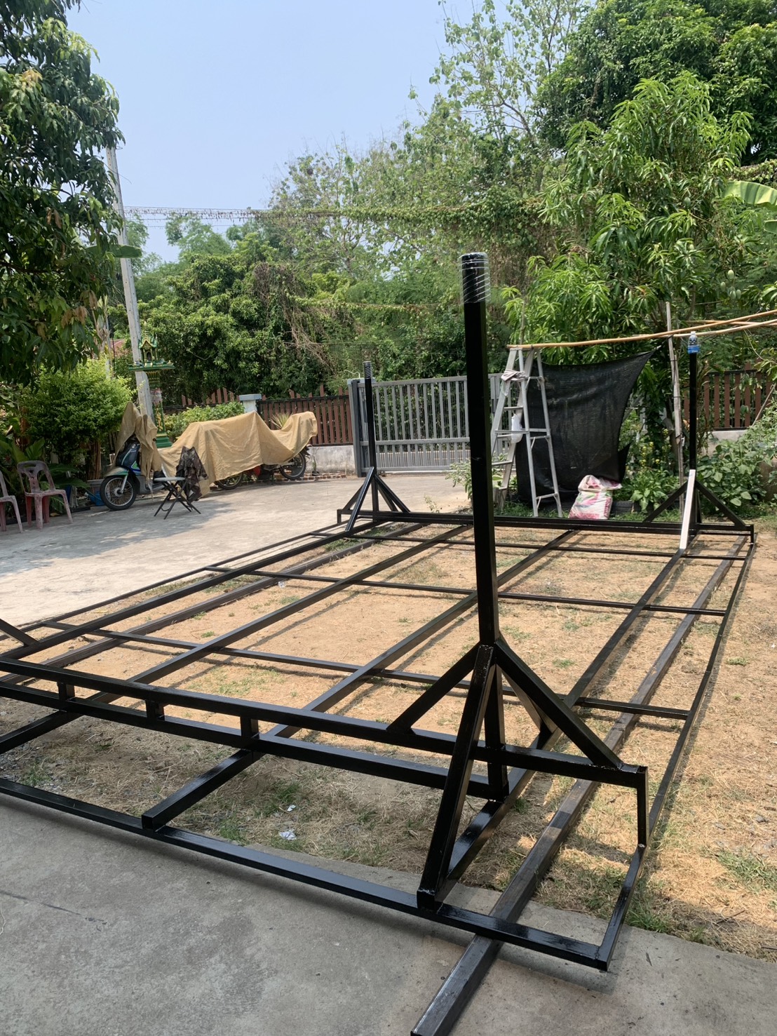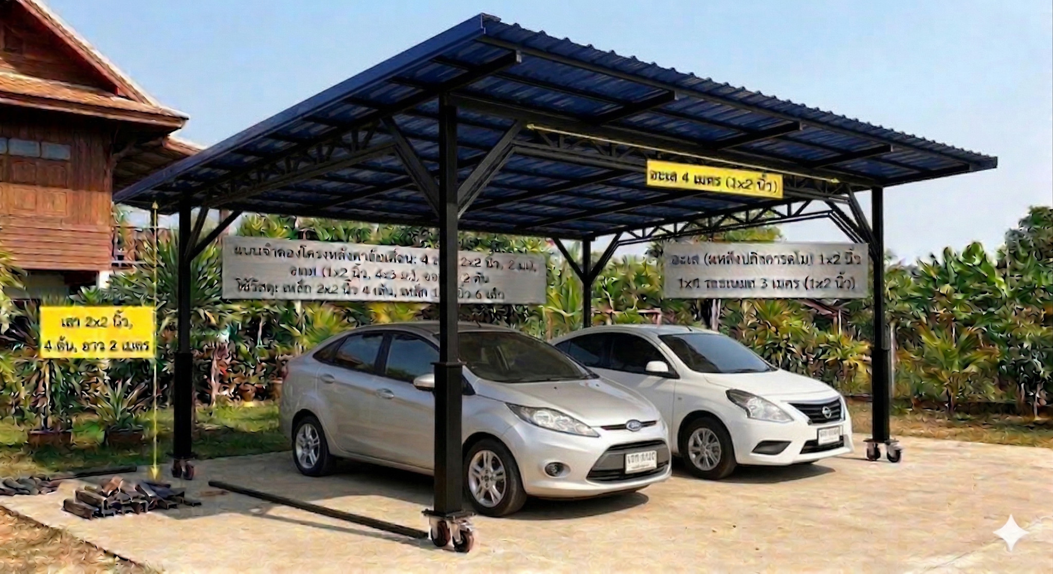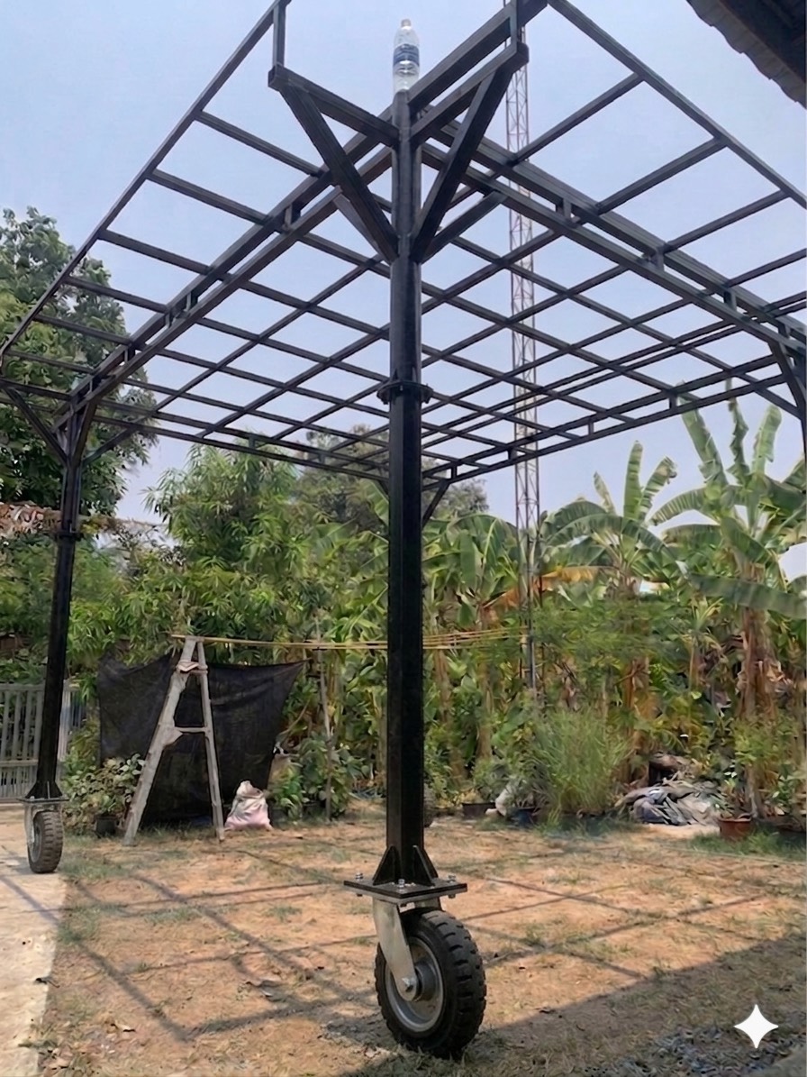 โครงหลังคา โรงจอดรถ หน้ากว้าง ประมาณ 4 เมตร ยาวประมาณ 5 เมตร สูงตั้งใจไว้ ใส่ล้อ และต่อขาเป็นท่อเหล็ก กว้าง 3.5 นิ้ว