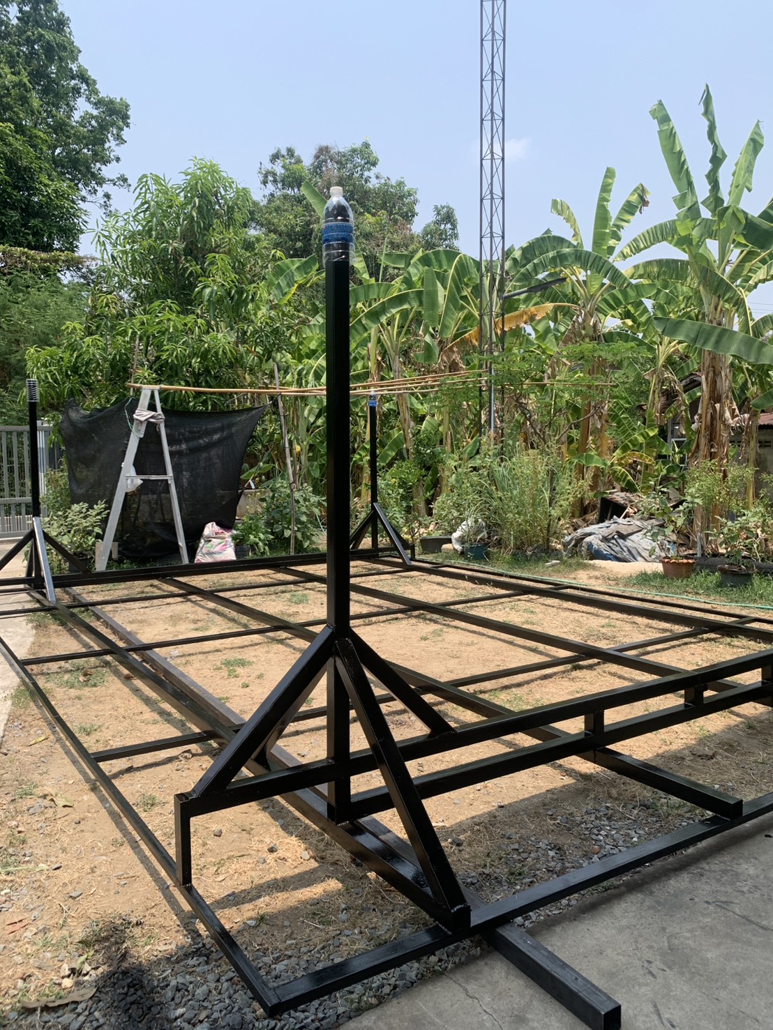 เหล็ก ยาว 6 เมตร หนาประมาณ 3.5 - 4 mm ก็ตั้งใจว่า จะเอามาตัด 4 ท่อน ท่อนละประมาณ 120 cm ร่วมกับล้อ 20 cm + รวมขาโครงหลังคาเดิม สูงถึงหลังคาประมาณ 160 cm รวมๆ ประมาณ 3 เมตร ใส่หลังคาอีก
