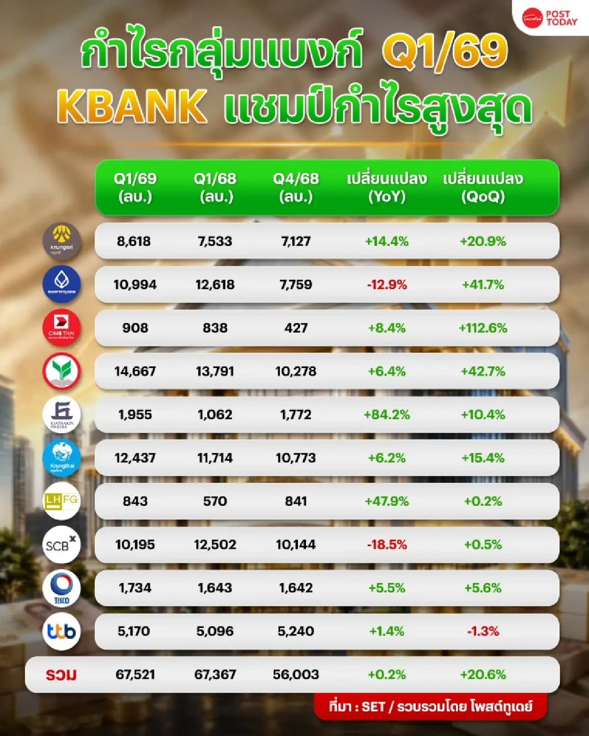 รวมงบกลุ่มแบงก์ ไตรมาส 1/69 กวาดกำไรสุทธิ 67,521 ล้านบาท โต 0.2% YoY พุ่ง 20.6% QoQ