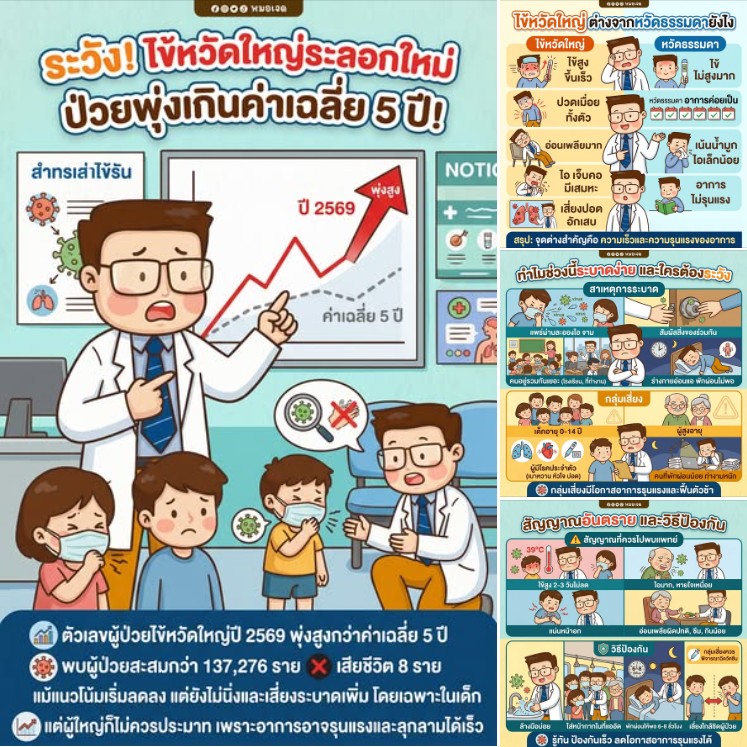 ไข้หวัดใหญ่รอบนี้ ตัวเลขชัดเจนว่าป่วยมากกว่าปกติ แม้อาการจะดูเหมือนไข้ทั่วไป แต่ความเสี่ยงอยู่ที่ “ความรุนแรงและการลุกลาม” ถ้ารู้ทัน ป้องกันดี และไม่ปล่อยให้อาการหนัก โอกาสหายก็มีสูง แต่ถ้าประมาท อาจกลายเป็นเรื่องใหญ่ได้ในเวลาไม่นานครับ