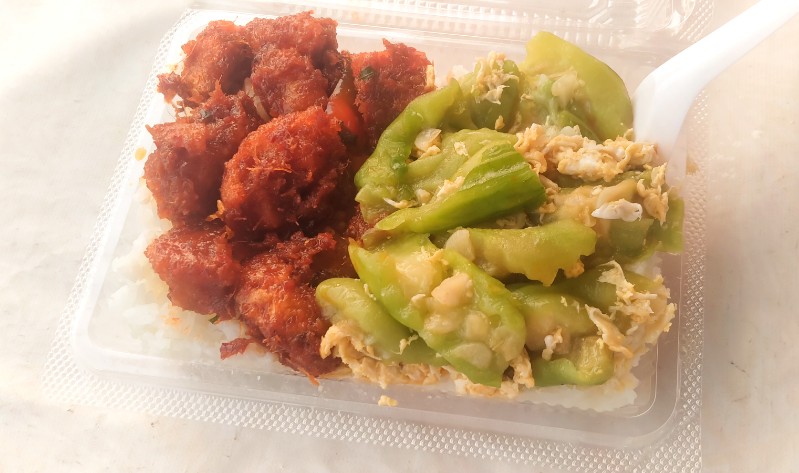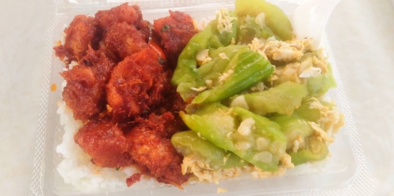 ข้าวแคบหมูผัดพริกแกง + ผัดบวบ 🍛🌶️🥒