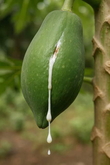 • ช่วงอายุต้น: เริ่มกรีดเมื่อผลมะละกอมีอายุประมาณ 70-100 วัน (ผลยังเขียวและมีขนาดเต็มที่แต่ยังไม่สุก)