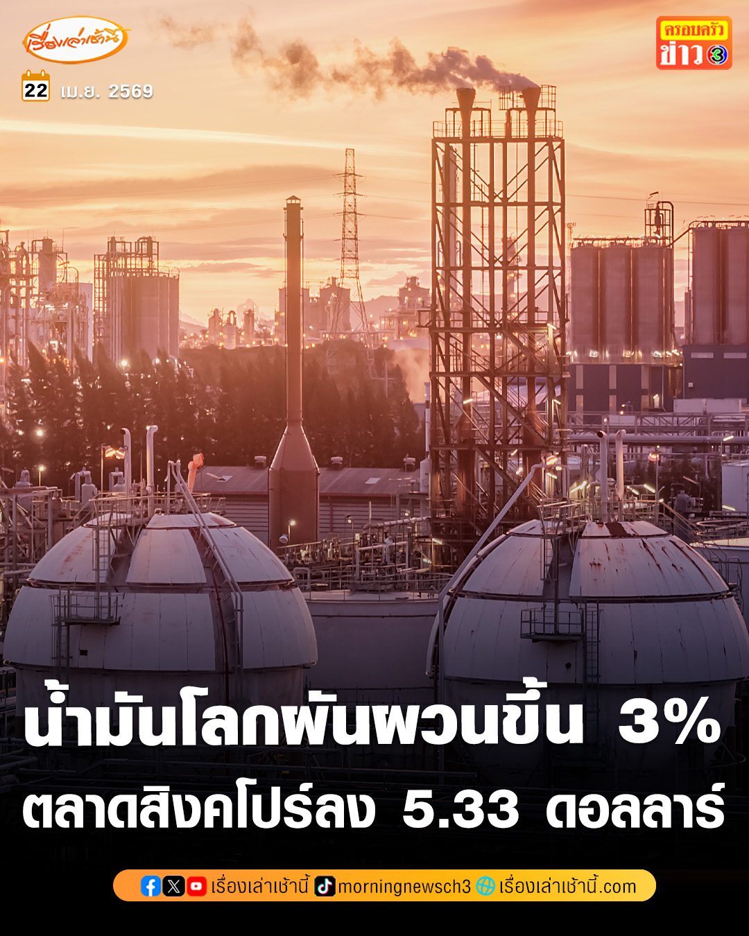 น้ำมันดิบโลกราคาผันผวน พุ่งทะลุ 100 ดอลลาร์/บาร์เรล ก่อนอ่อนตัวลง หลังประธานาธิบดีโดนัลด์ ทรัมป์ ของสหรัฐฯ ขยายเวลาหยุดยิงอิหร่าน โดยปิดตลาดในวันอังคาร (21 เม.ย.) น้ำมันดิบเวสต์เท็กซัส เพิ่มขึ้น 2.25 ดอลลาร์ หรือ 2.57% ปิดที่ 89.67 ดอลลาร์/บาร์เรล ส่วน เบรนท์ ลอนดอน เพิ่มขึ้น 3 ดอลลาร์ หรือ 3.14% ปิดที่ 98.48 ดอลลาร์/บาร์เรล ขณะที่น้ำมันสำเร็จรูปสิงคโปร์ ปรับลดลง 5.33 ดอลลาร์ ปิดที่ 188.47 ดอลลาร์/บาร์เรล