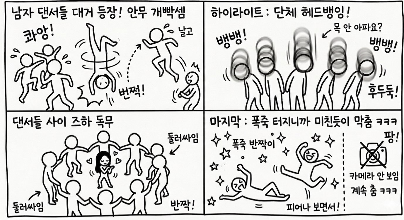แดนเซอร์ผู้ชายเต้นท่าทางโหดมาก มีทั้งตีลังกาและหมุนตัวแบบสุดบ้าคลั่ง แล้วช่วงไฮไลต์ที่เฮดแบงก็เดือดสุดๆ
