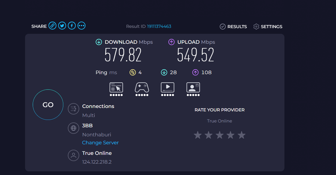 คราวนี้เปลี่ยนมาใช้ของทรู โปร 499 บาท ความเร็ว 500/500