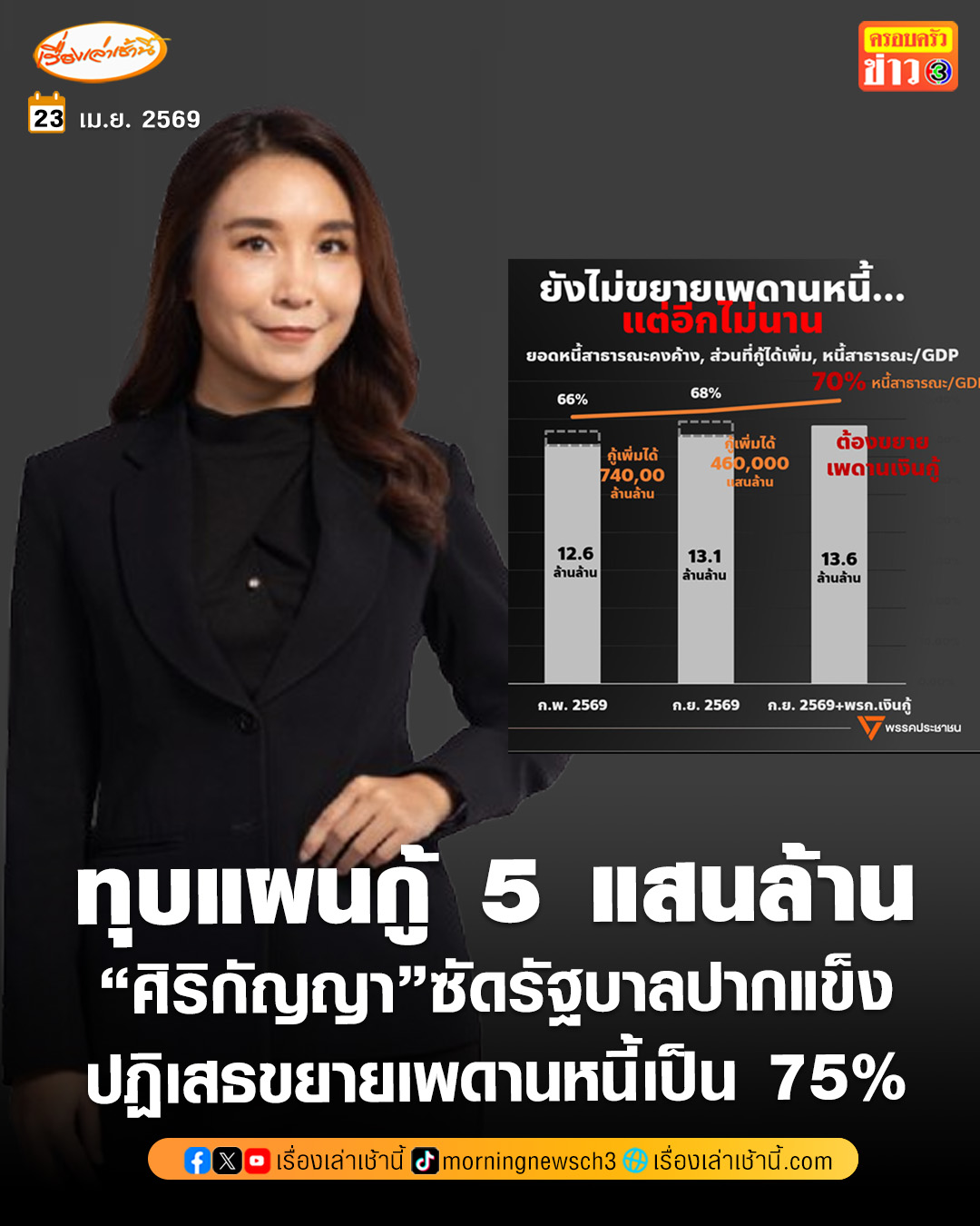 เมื่อเวลา 22.42 น. วันที่ 22 เม.ย. 2569 น.ส.ศิริกัญญา ตันสกุล สส.บัญชีรายชื่อ รองหัวหน้าพรรคประชาชน โพสต์เฟซบุ๊กในหัวข้อ "ยังไม่ขยายเพดานหนี้ตอนนี้ แต่พอจะกู้ก็ต้องขยายอยู่ดี" โดยระบุว่า