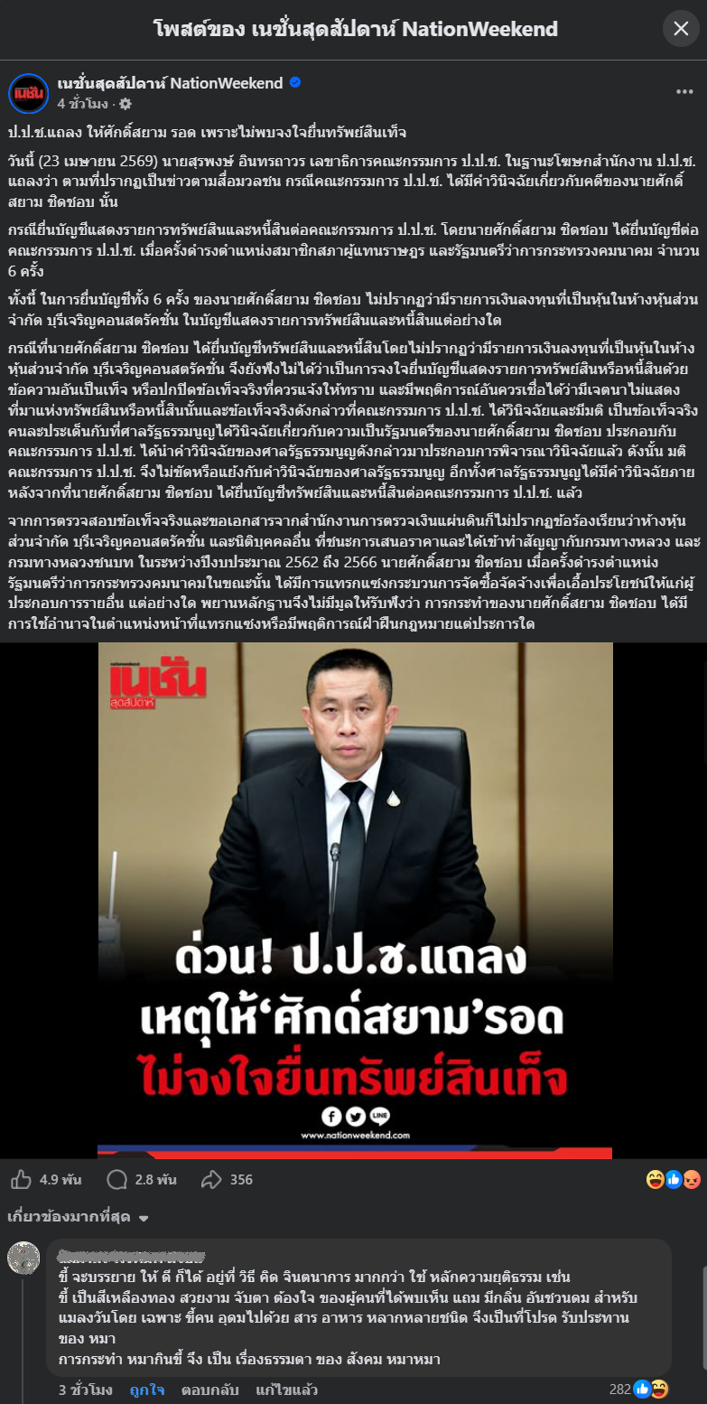 ป.ป.ช.แถลง ให้ศักดิ์สยาม รอด เพราะไม่พบจงใจยื่นทรัพย์สินเท็จ