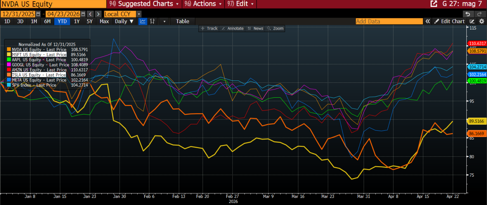 กราฟเทียบ Magnificent 7 แบบ normalized (YTD) จะเห็นว่า Tesla วิ่งแย่สุดในกลุ่ม สะท้อนว่าตลาดยังไม่ “ซื้อฝัน” เท่าไหร่ในตอนนี้