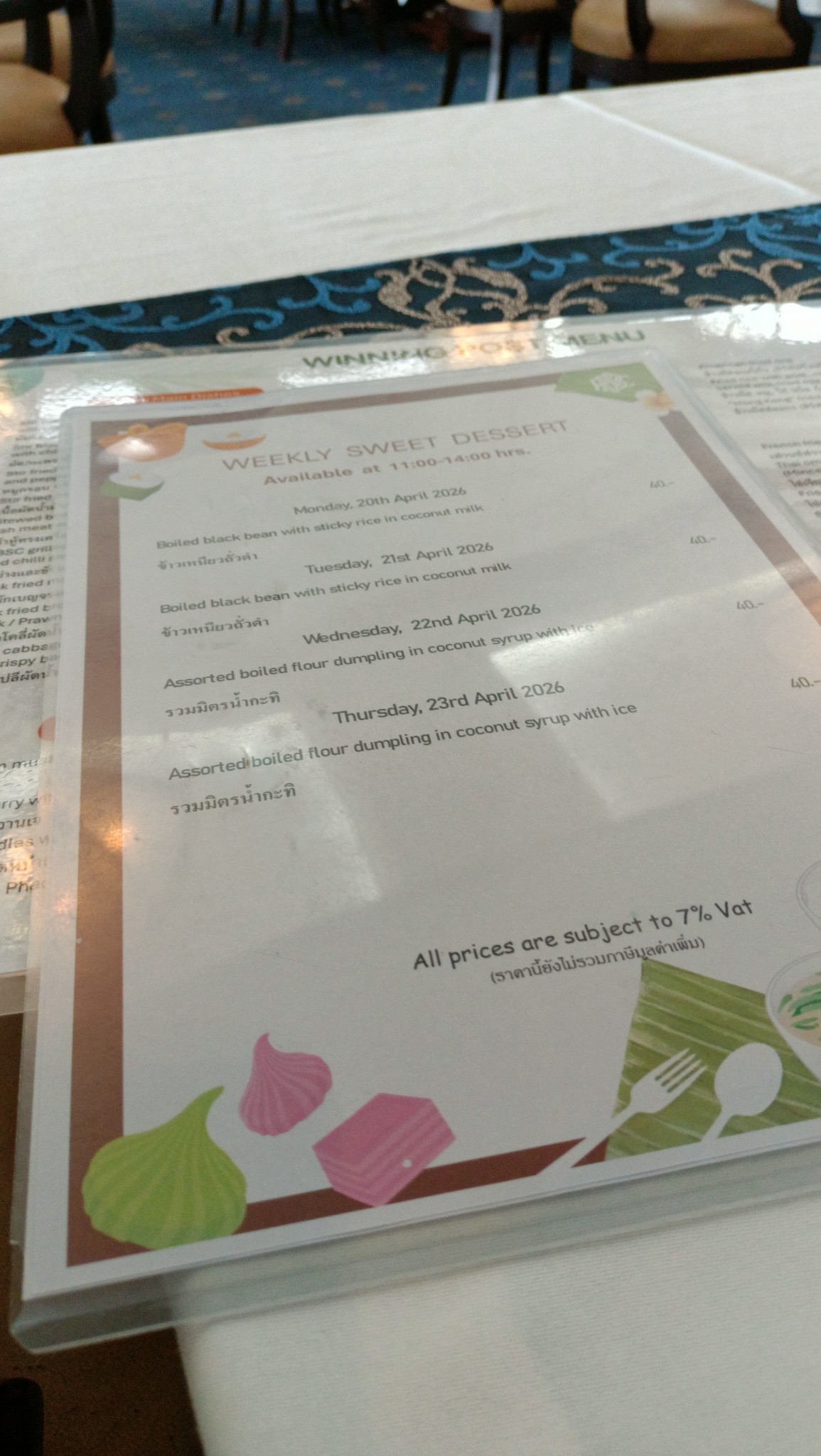 แต่ผมเห็นเมนู อีกแผ่นนึง มีบอกวันที่ไว้ด้วย 21 เมษา มีข้าวเหนียวดำ