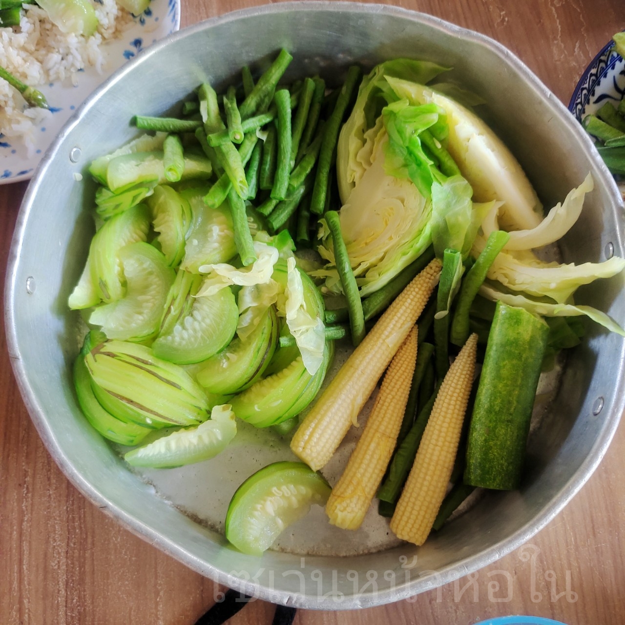 ผักลวกเครื่องจิ้มกับน้ำพริกปลาร้าในวันนี้ ถั่วฝักยาว กะหล่ำปลี แตงโมอ่อน ข้าวโพดดอ่อน