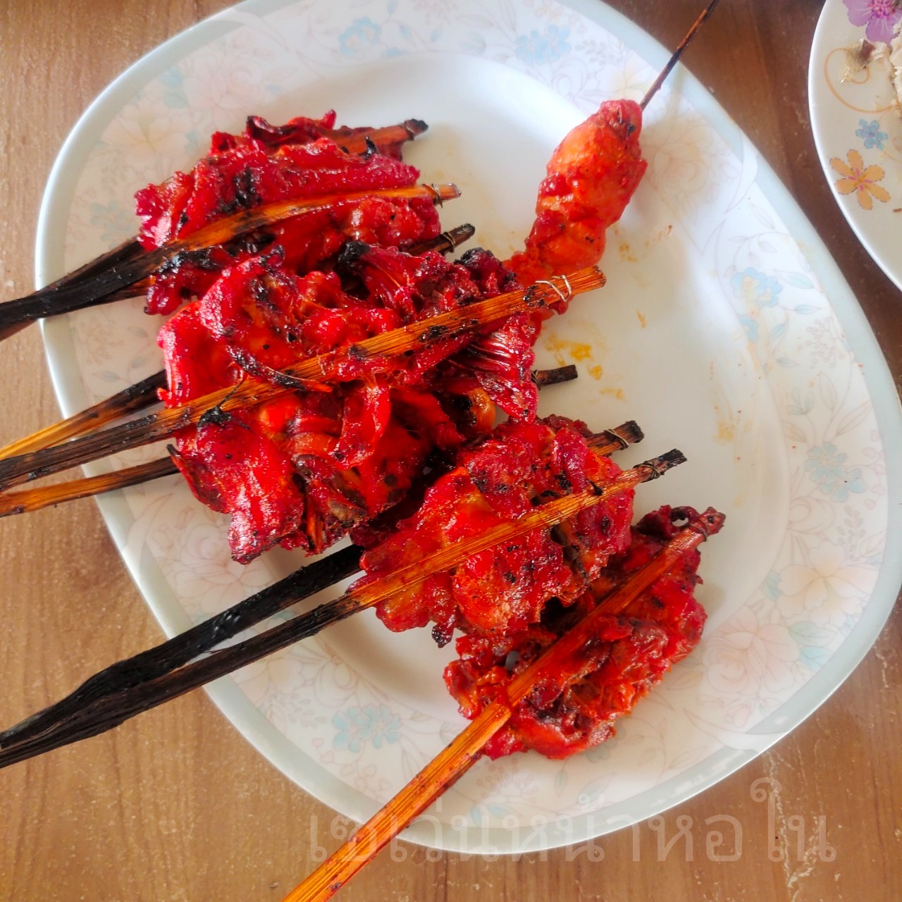 เสริมความเจริญอาหารด้วยไก่ย่างแดง ซื้อมาจากตลาด ไม้ละ5บาทครับ