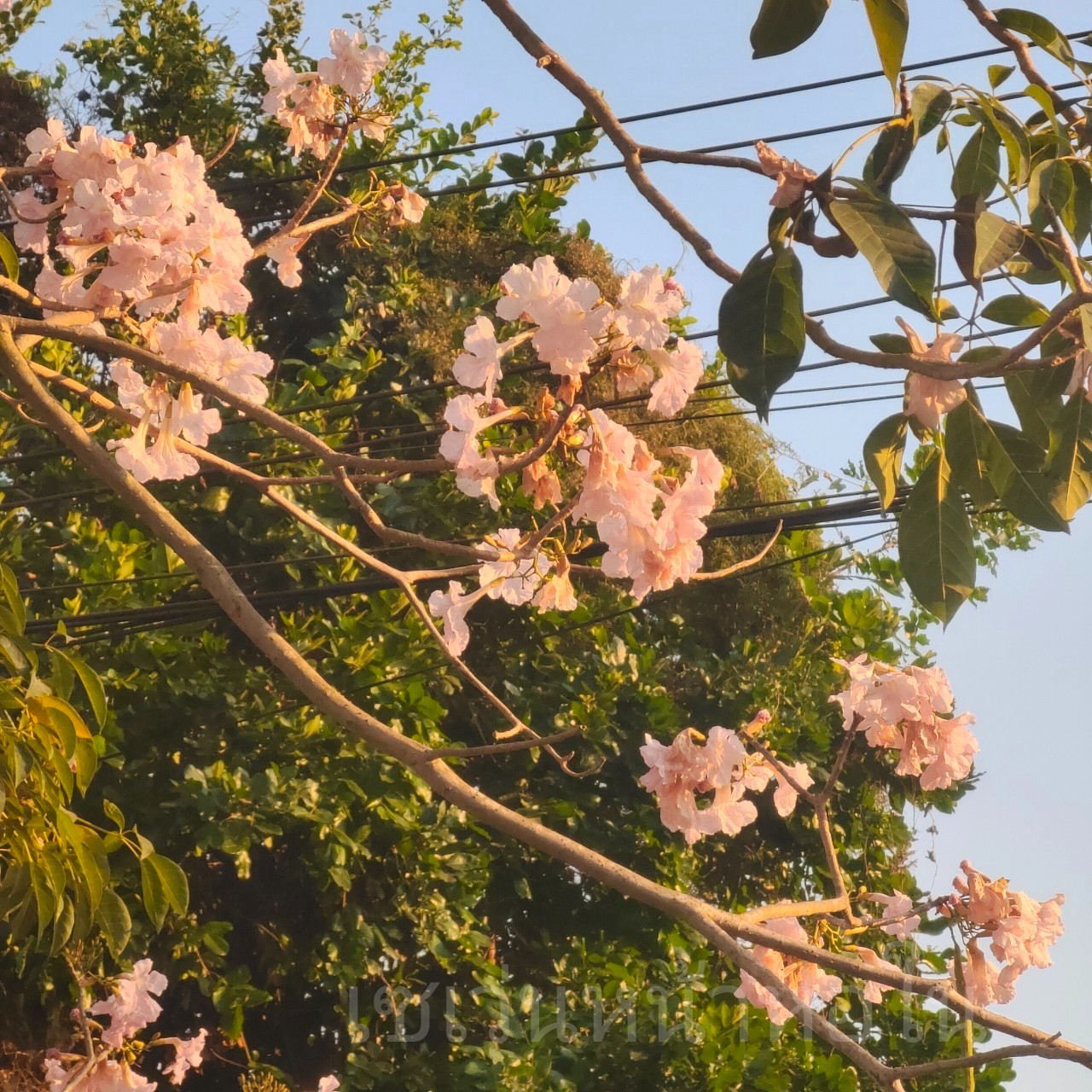 ต้นชมพูพันธุ์ทิพย์ กำลังออกดอกสีชมพูสวย ต้นนี้ปลูกอยู่บนที่ของผม