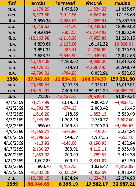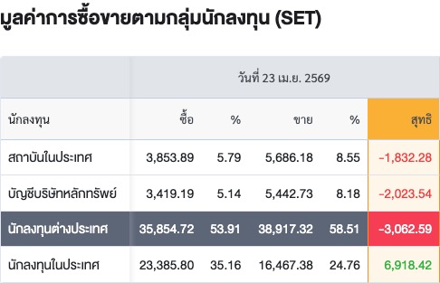 Sinthorn Summary 23/4/2569 : ต่างชาติขายสุทธิ -3,062.59 ลบ.