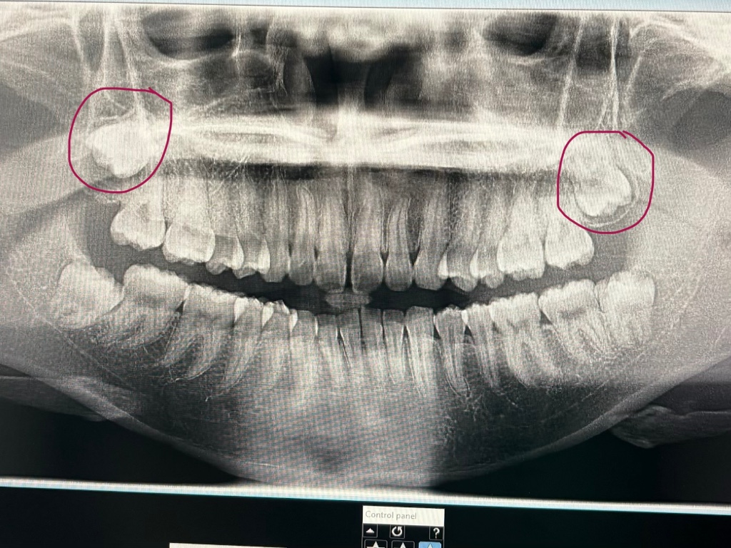 แต่พอดูฟิล์ม X-ray แล้ว สังเกตว่าฟันกรามด้านบนทั้ง 2 ข้าง เหมือนจะเป็นฟันคุดด้วย (หรือเปล่าไม่แน่ใจ) (ยังไม่เคยมีอาการปวดหรืออักเสบเลยค่ะ) เลยสงสัยว่า