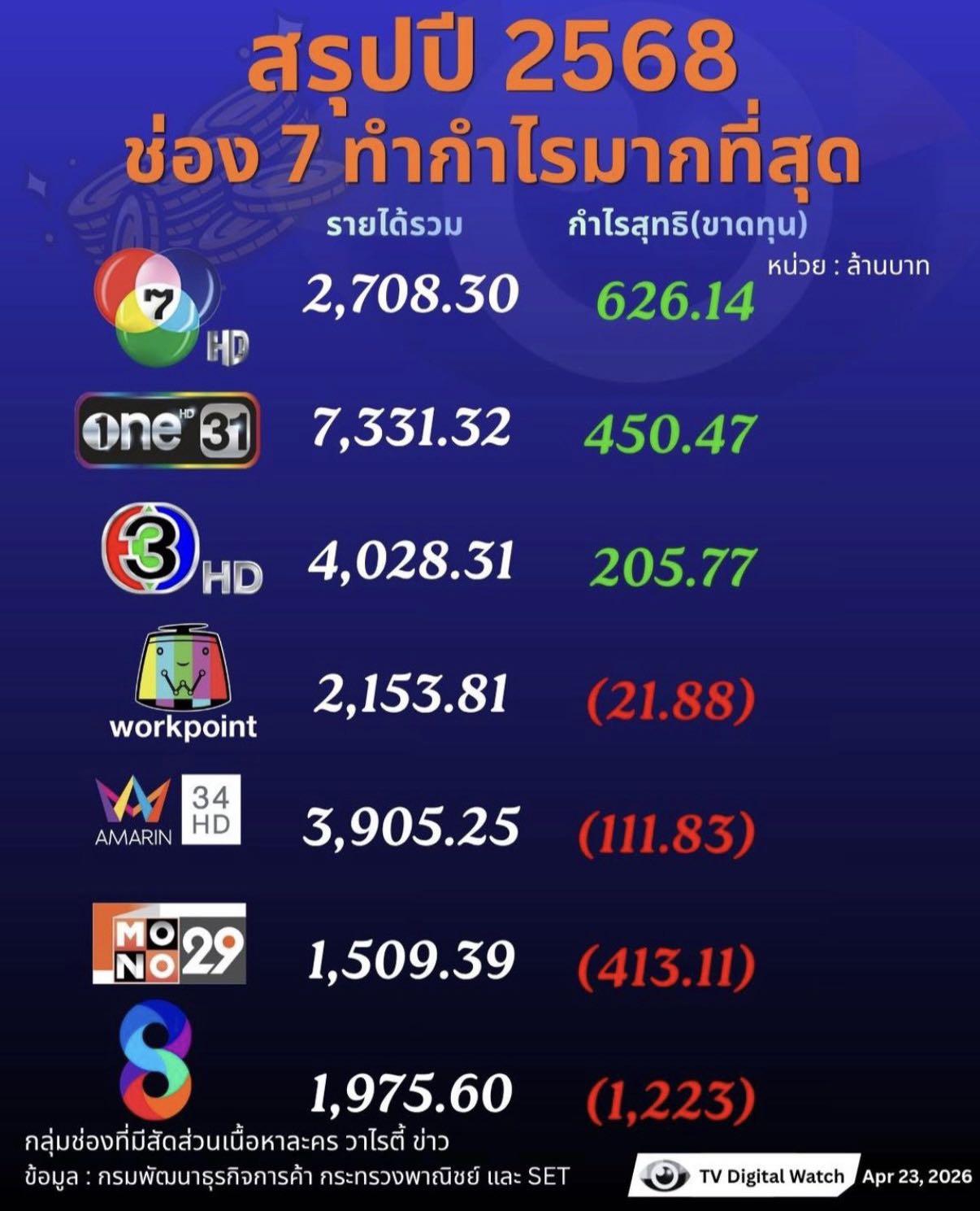 วี้ดดดด ผลประกอบการทีวี 3 ช่องยักษ์ 2568 ช่อง7 จับมือ ช่องวัน ทํากําไรสูง เริ่ดๆทุบๆ พร้อมช่อง 3 รั้งท้าย ❤️